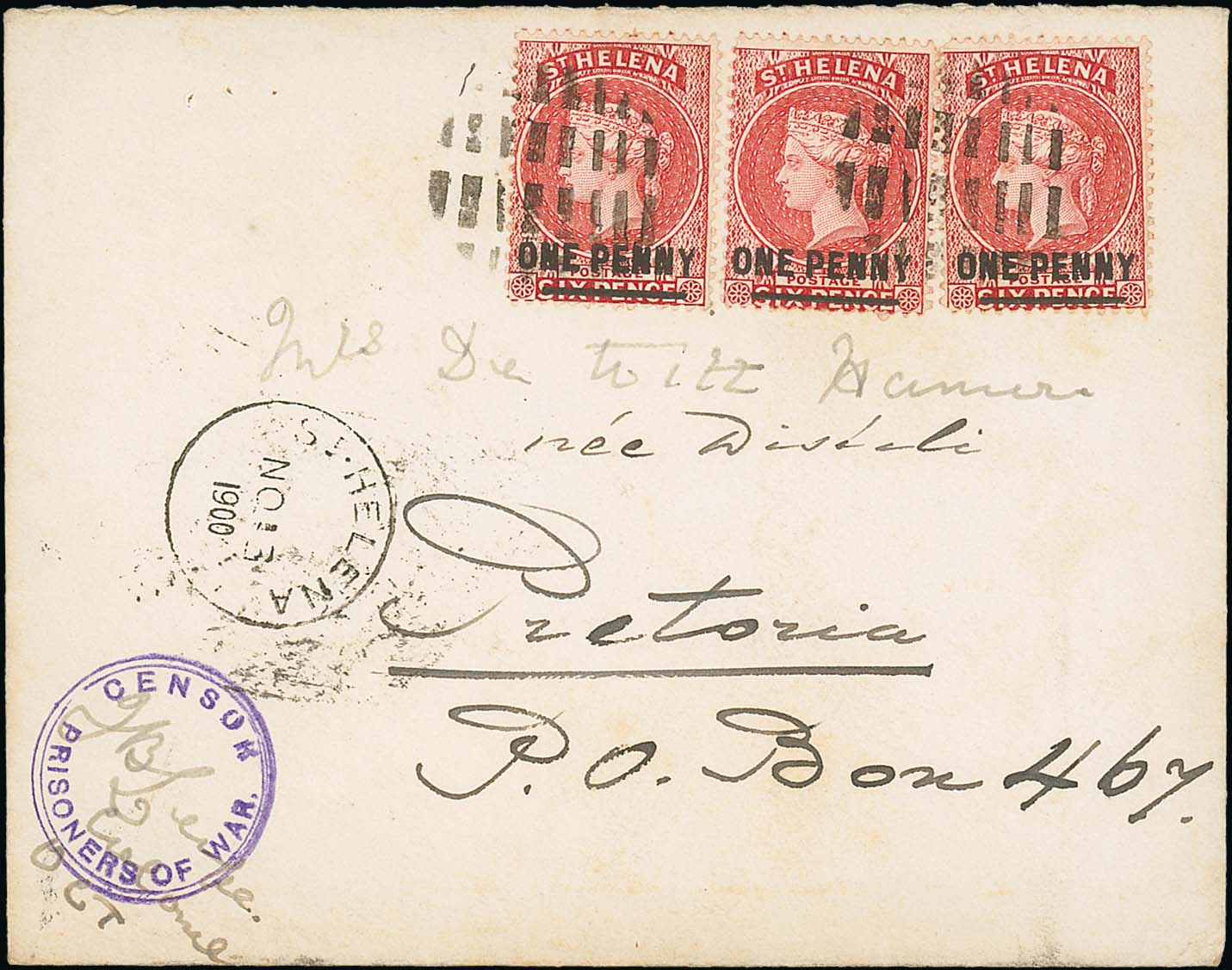 1900 (Nov 13) Cover from Col. de Witt Hamer to his wife in Pretoria, three 1d stamps tied by cork cancels (K95), St. Helena c.d.s and violet circular censor cachet signed "J.B Leefe, Colonel, OCT". Col. Leefe, Royal Marine