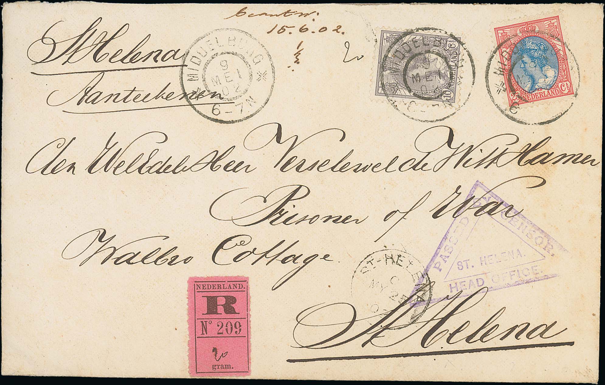 1902 (May 9) Registered cover from Holland to Capt. de Witt Hamer at Walbro Cottage, franked 10c + 25c tied by Middelburg datestamps with pink registration label, arrival c.d.s (May 25) and violet triangular "PASSED / BY /