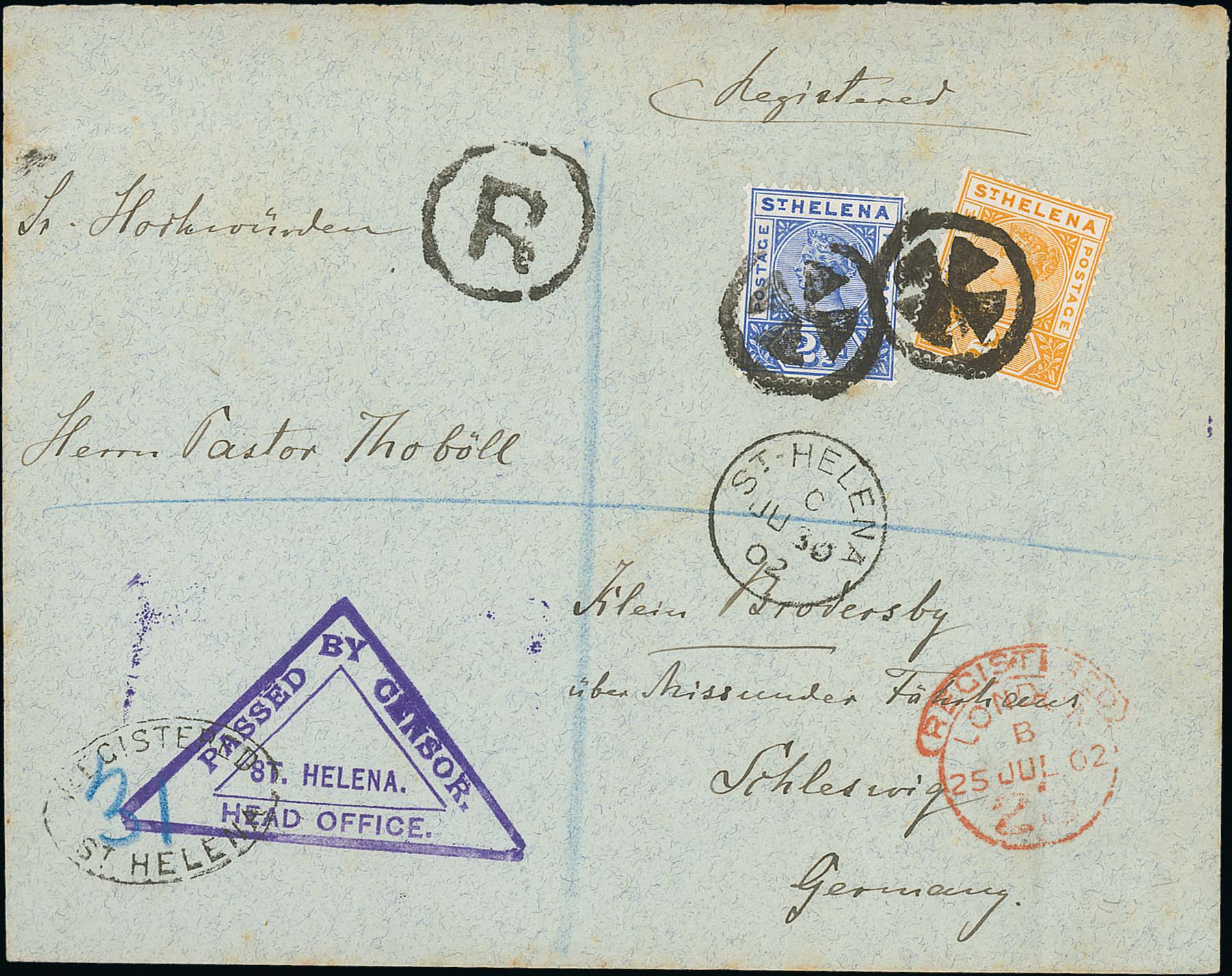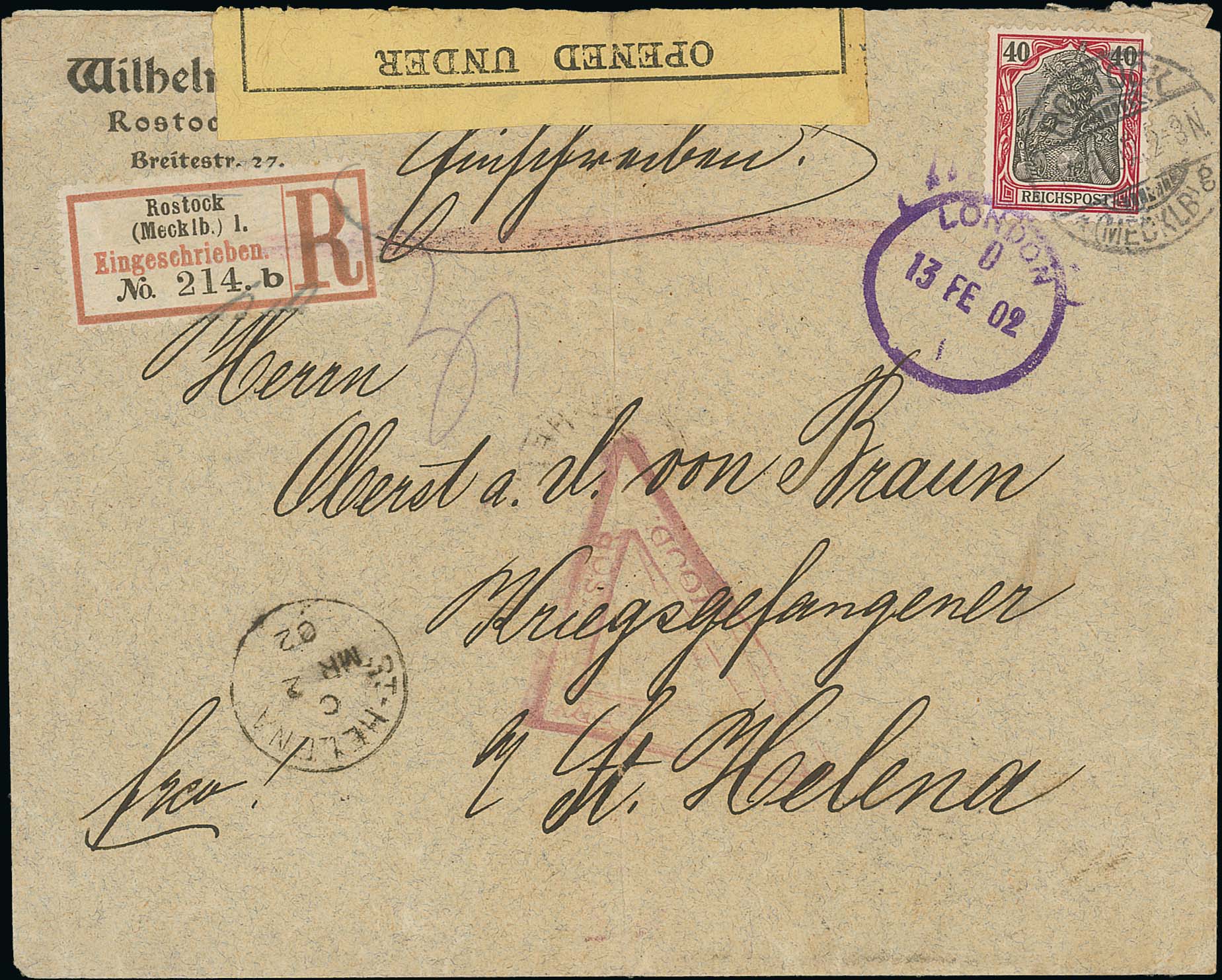 1902 (Feb 11) Registered cover from Rostock to Colonel Von Braun in St. Helena, franked Germany 40pf tied by Rostock c.d.s and bearing a registration label, London and St. Helena (Mar. 2) datestamps, red triangular "PASSED BY