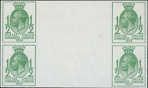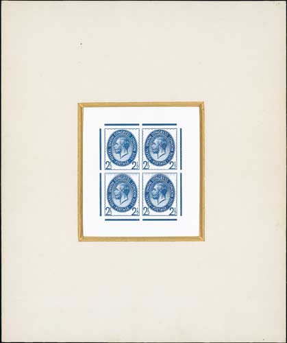 176 image1929 Postal Union Congress ½d - 2½d in specially prepared imperforate miniature sheets of four with marginal lines on white glazed paper mounted in sunken gilt edged card frames, with an accompanying letter from the Post Office Secretary, Sir G.E.P Murray to Campbell Dodgson forwarding these proofs on behalf of the Postmaster General. Only a tiny number of miniature sheets were prepared for presentation purposes; Campbell Dodgson was a member of the Committee that selected the designs for these stamps. Superb and very rare. S.G. £70,000. (4). Photo on Page 26. (Image1)