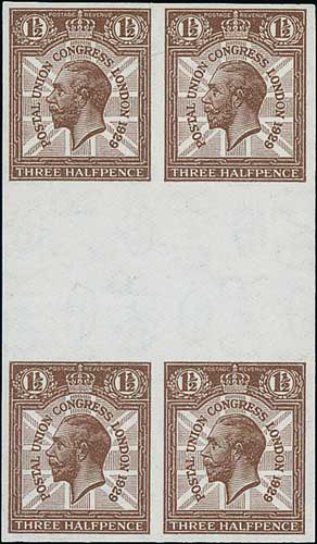 178 image1929 PUC 1½d Brown, imperforate vertical interpanneau imprimatur block of four from the coil printing with sideways watermark. From the British Postal Museum Archives, each stamp with "BPMA" handstamp on reverse, fine unmounted mint. Photo on Page 30. (Image1)