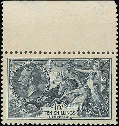 179 image1934 Re-engraved 2/6 - 10/- set of three fine unmounted mint, all marginal (mounted in the margins only), also 2/6 (2), 5/- (2) and 10/- used. S.G. 450/2, £1,400. (3). Photo on Page 18. (Image1)