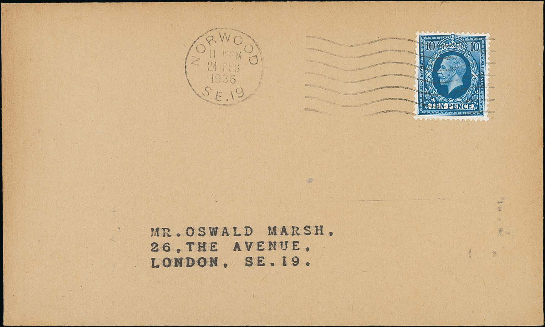 184 image1936 (Feb 24) 10d Photogravure used on First Day Cover, cancelled by Norwood machine, fine and very scarce. Photo on Page 14. (Image1)