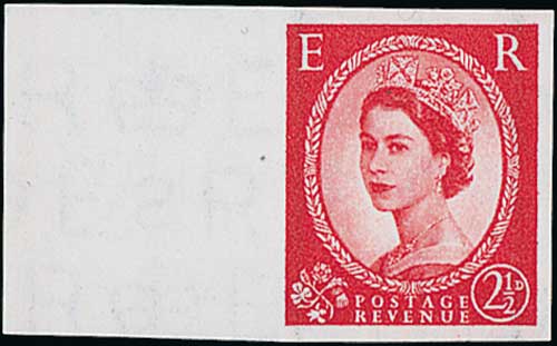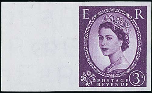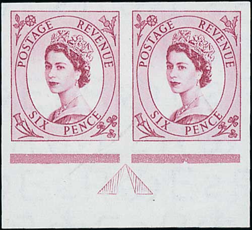 189 image1955 6d Imperforate imprimatur pair, watermark St. Edwards Crown, lower margin with central sheet arrow, from the British Postal Museum archive each with "BPMA" handstamp on reverse. A rare positional pair, unmounted. Photo on Page 18. (Image1)
