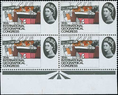 192 image1964 International Geographical Congress 4d block of four, variety violet (face value) omitted, lower margin with central arrow, superb unmounted. S.G. 652a, £900+. Photo on Page 28. (Image1)