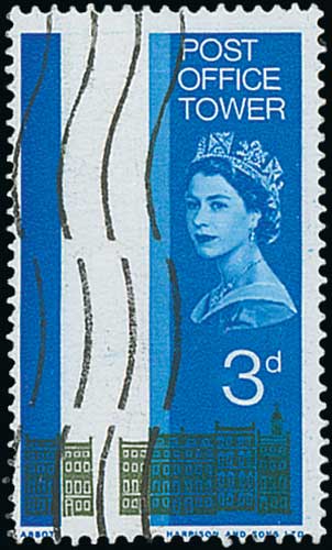 194 image1965 3d Post Office Tower, variety olive-yellow (Tower) omitted, used. A rare and very striking error. S.G. 679a, £2,200. Photo on Page 18. (Image1)
