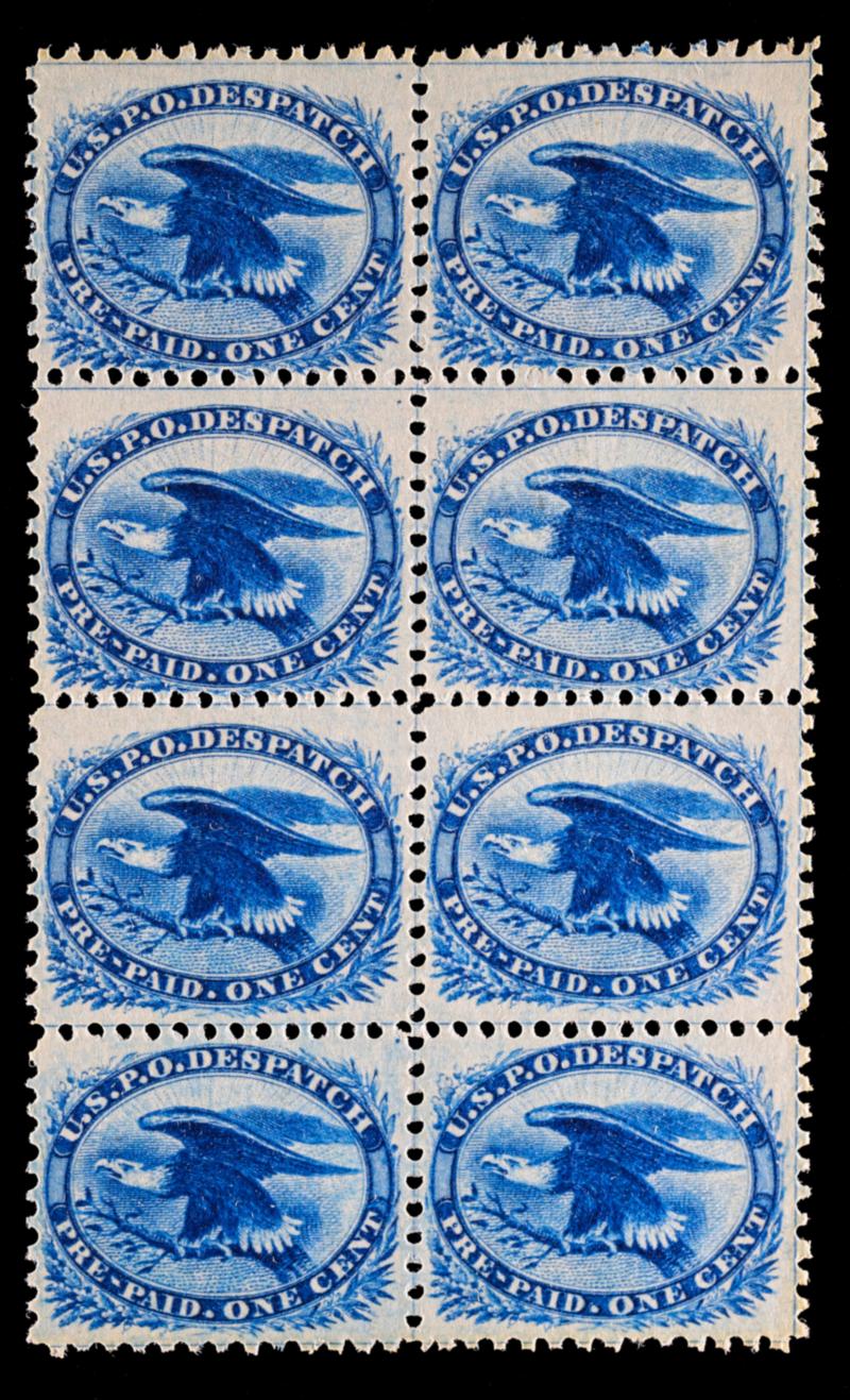 Eagle Carrier, LO6, 1c Blue, 1875 Special Printing, Block of 8, Unused Positions 17, 18, 27, 28, 37, 38, 47, and 48.