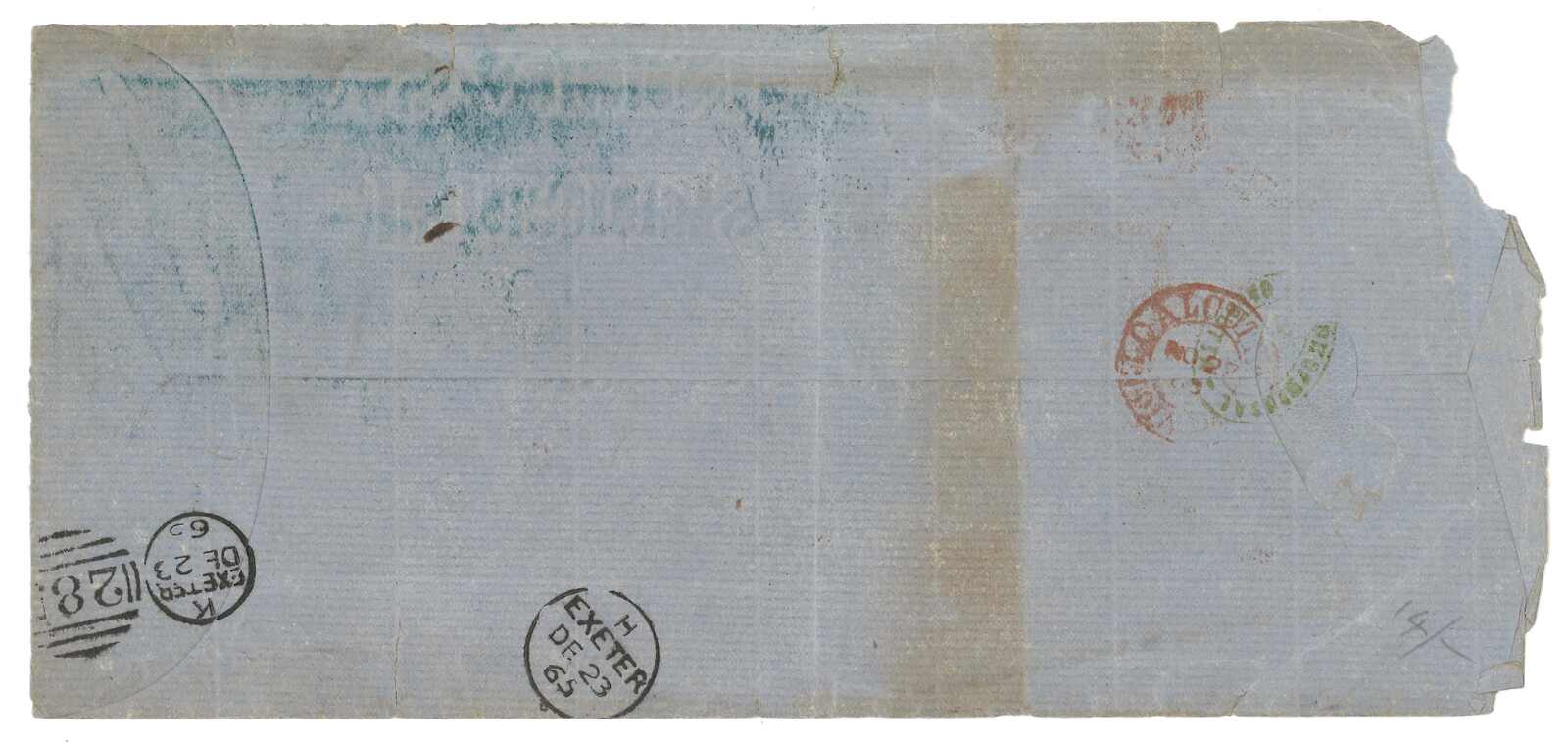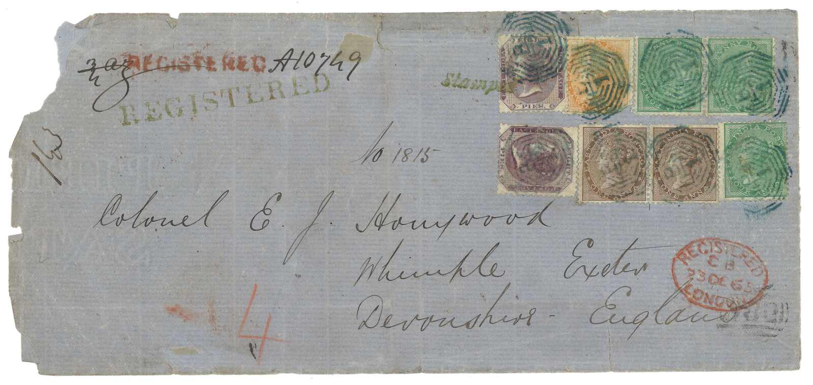 417 image1865 Calcutta (27 Nov) to England. Registered cover, f.w. East India QV issue x8, in total of 16a16p, tied by octagonal B1 obliterator, matching with Calcutta / India Paid cds on reverse. On front with multiple registered mark. Transit London (23 Dec). Arrived Exeter (23 Dec). Roughly opened at left(Image 1) (Image 2)