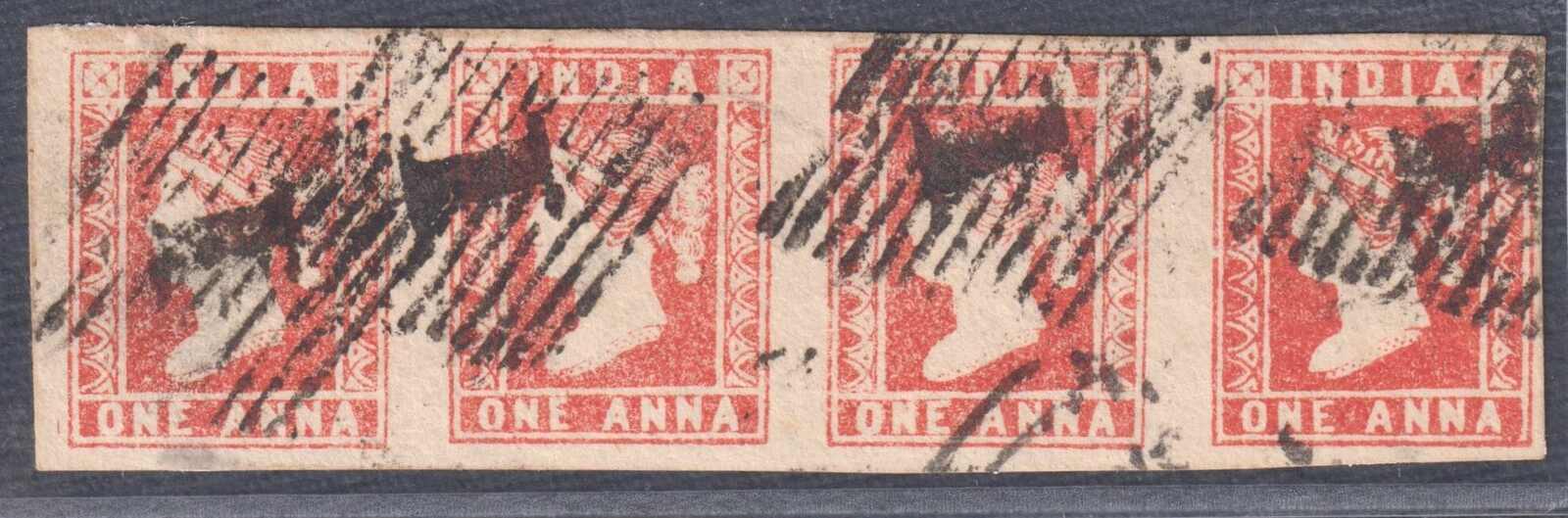 415 image1854 Indian QV litho 1 Anna red (SG14; Die II) in horizontal strip of 4 with margin all around, tied by Bombay typr 4 diamond of dots. Hinged. F-VF(Image 1) (All Images)