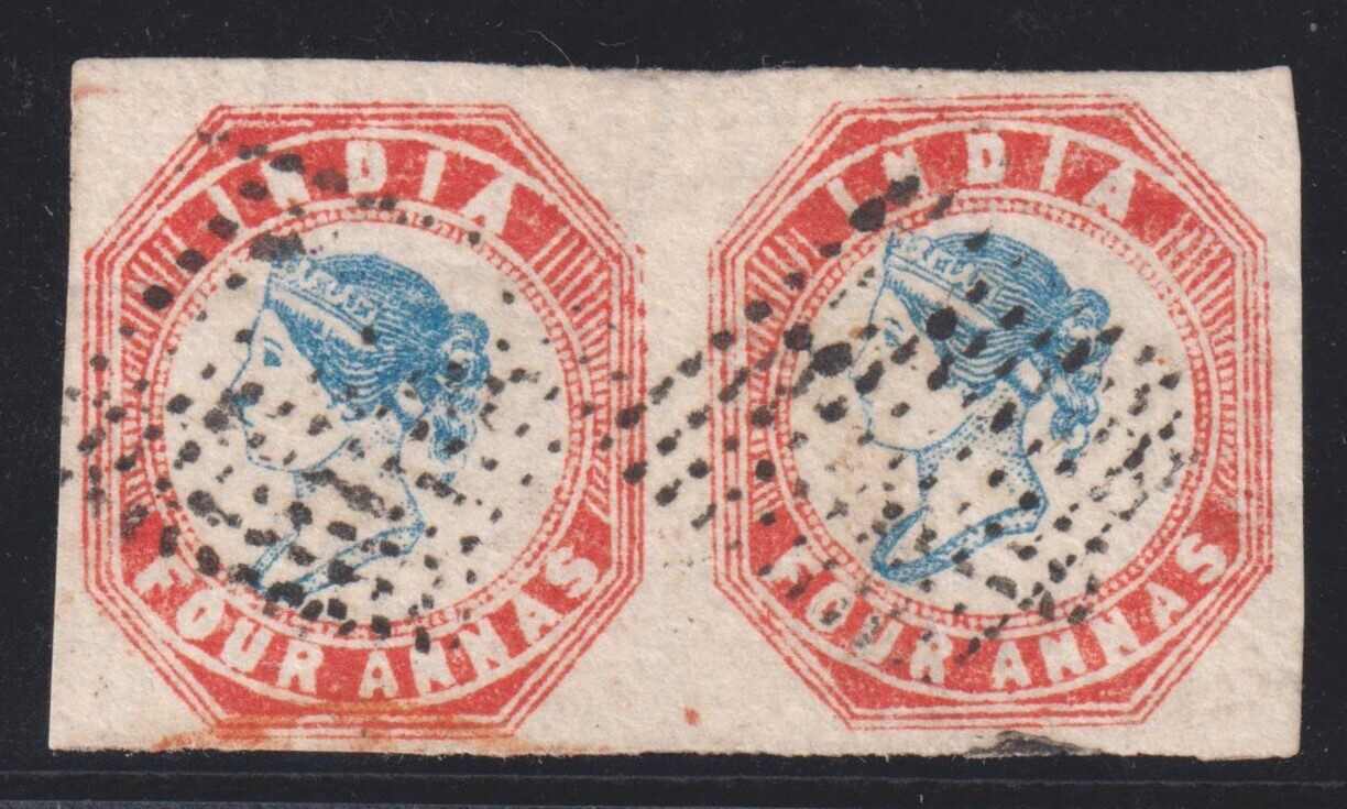 416 image1855 Indian QV litho 4 Annas (SG23; close-setting; Head Die III; Frame Die II; 4th Printing; Position 4-5; Reversed Wmk) in horizontal pair, tied by diamond of dots. Clean margins all around. Choice Very Fine(Image 1) (All Images)