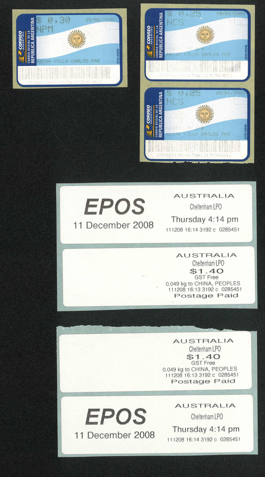 3533 cover image1995 (27 Dec) Argentina “Post Emblem” ATM stamp FDC (Mi Nr. 1), f.w. $0.75 stamp with printing shifted variety, tied by commemorative cds. Two vending machine were in service since 27 Dec 1995 in Buenos Aires. However, two machines were shut down on 18 Jan 1996 due to technical problem and legal disagreement. Catalogue price EUR600. Plus several other ATM mint stamps and covers applied with postage labels.