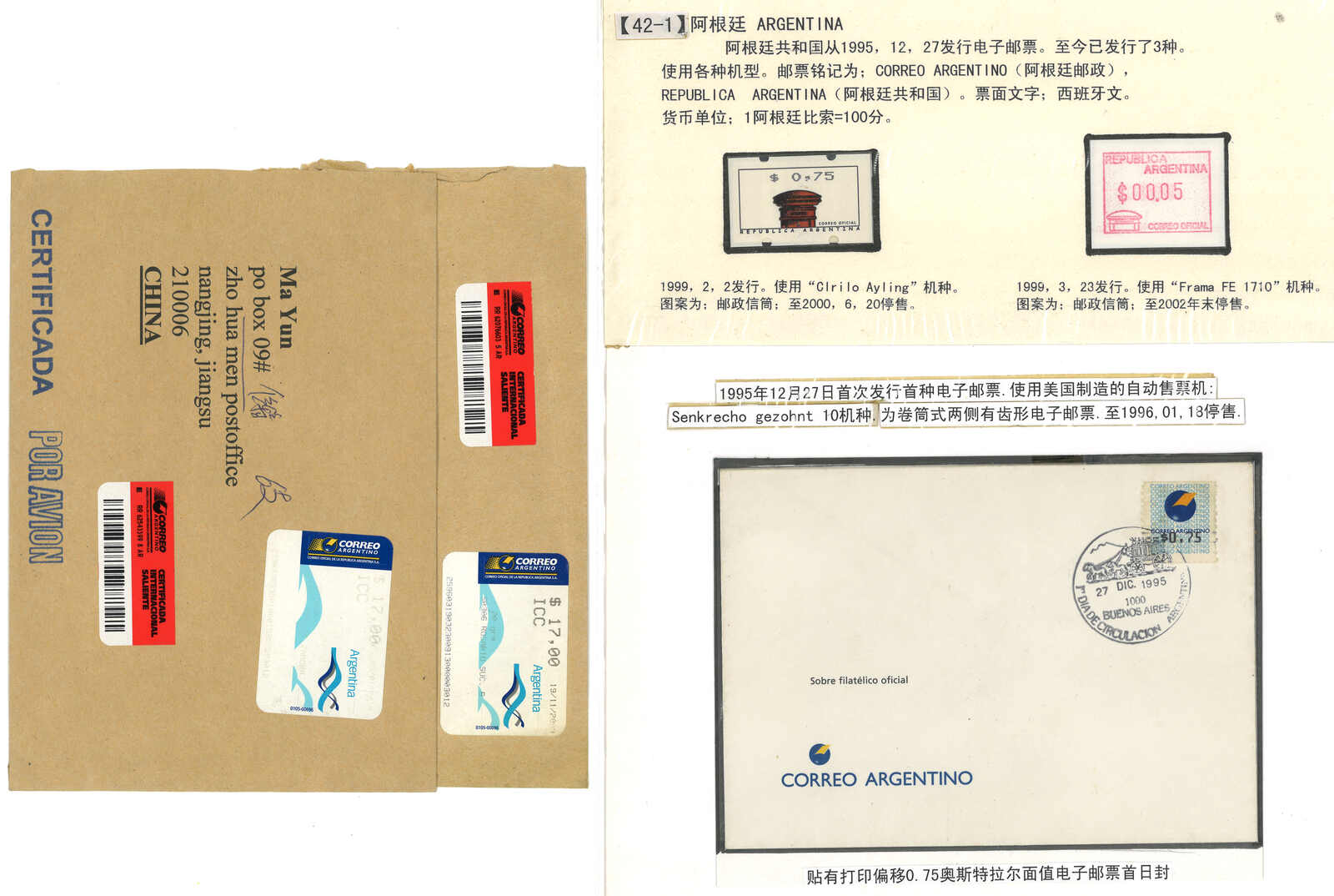 1995.12.27 阿根廷“郵徽”電子郵票首日封(Mi. Nr 1),貼0.75元票,帶套印移位變異,銷紀念日戳。此為阿根廷首款電 子郵票,兩部售賣機設於布宜諾斯艾利斯,於1995年12月27日投入使用,但由於技術和法律問題,於1996年1月18日便告停 機。目錄價格600歐元。另附數枚電子郵票及貼用郵資標之信封。(Image 1) (Image 2)