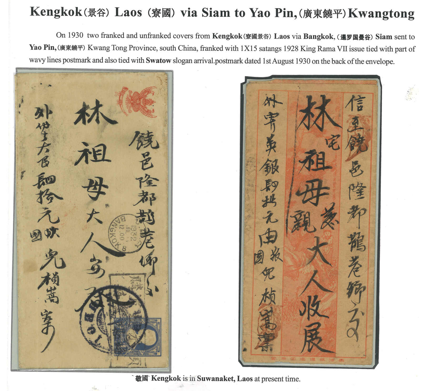 1920-1930年代一對自老撾敬國經曼谷寄饒平之銀信。一件為15 Stg郵資封,另一件無貼票。自1930年起,寄自暹羅之僑批需要貼票。(Image 1) (All Images)