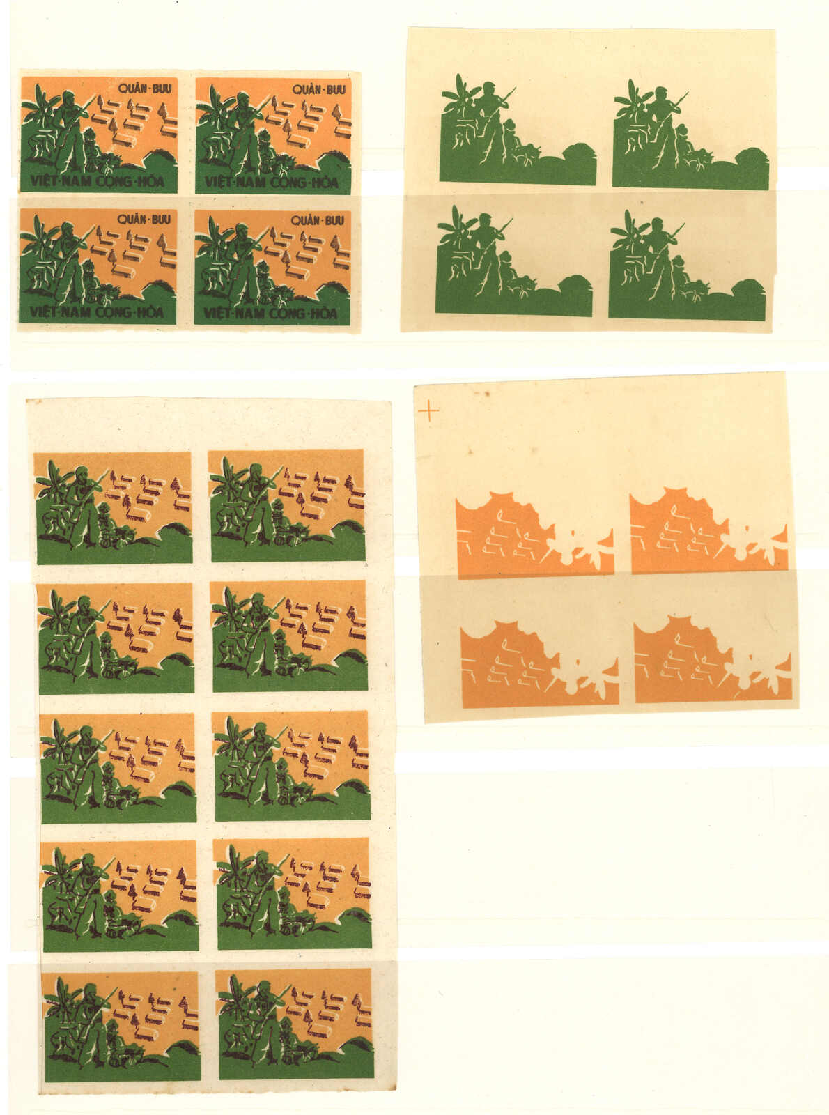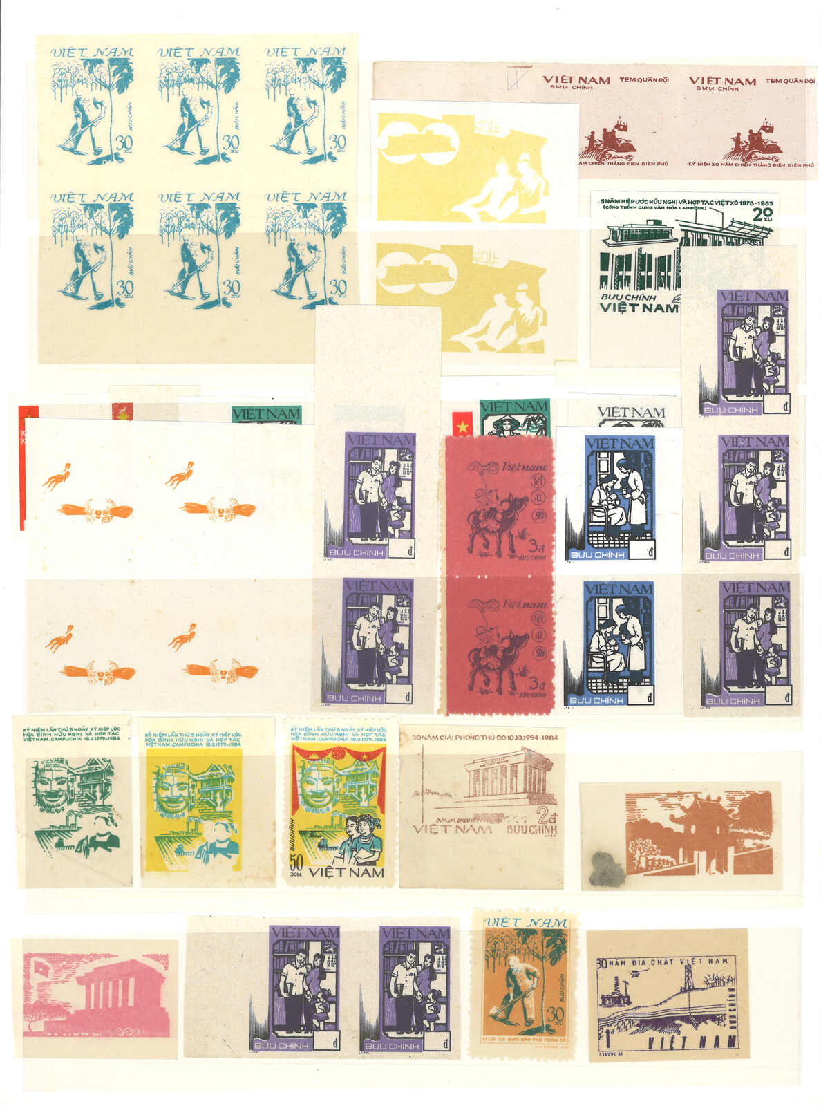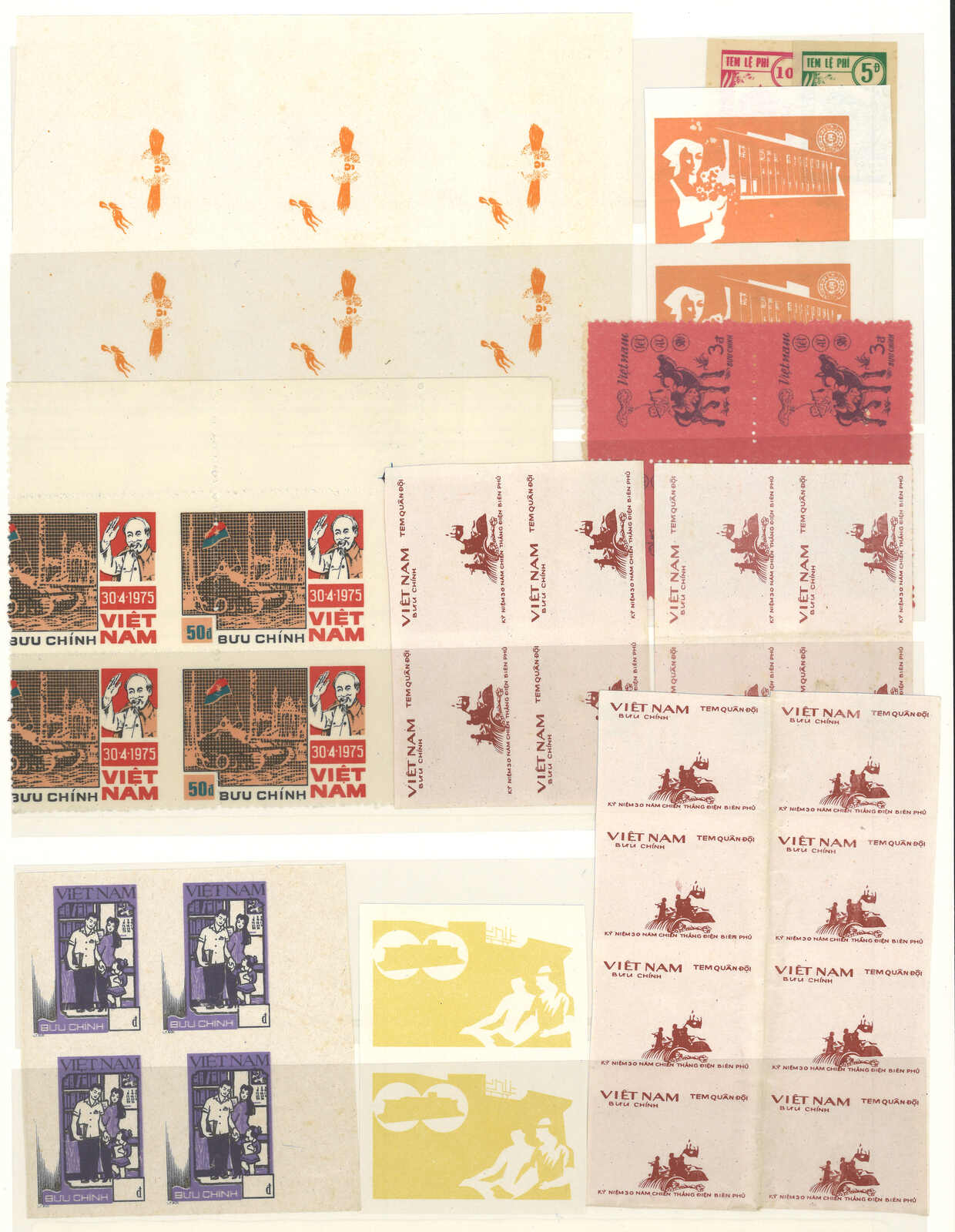 1970年代一組約100枚越南變異票,包括1961年軍郵票等。展示了齒孔移位、漏色、漏齒等變異。(Image 1) (Image 2) (Image 3)