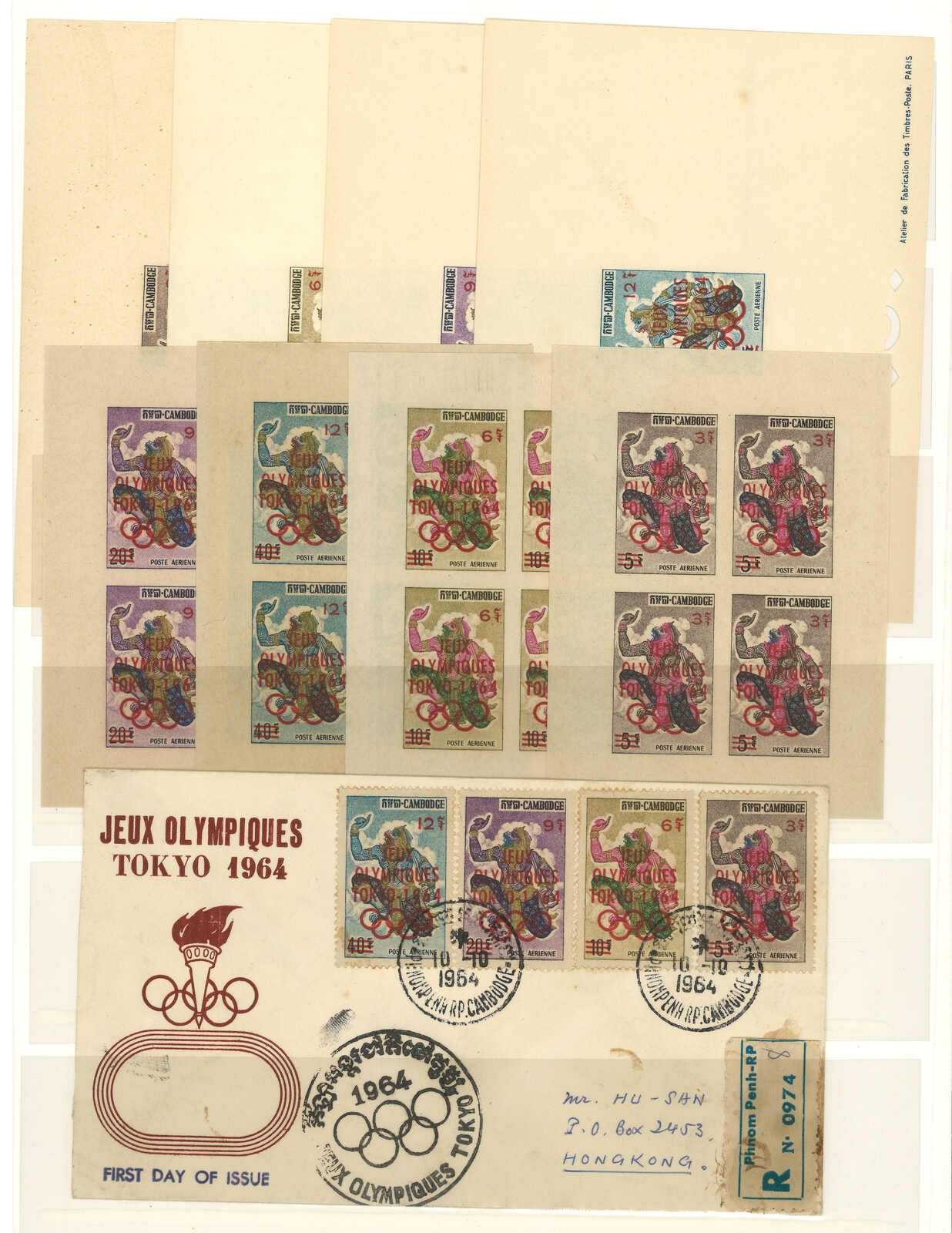 447 ** image1950-1960s a collection of Cambodia Apsara, Wild Animal Proctection and airmail ovpt. "Olympic Games" issue deluxe die proof, imperf block and FDC. MNH with slight toning. F-VF.