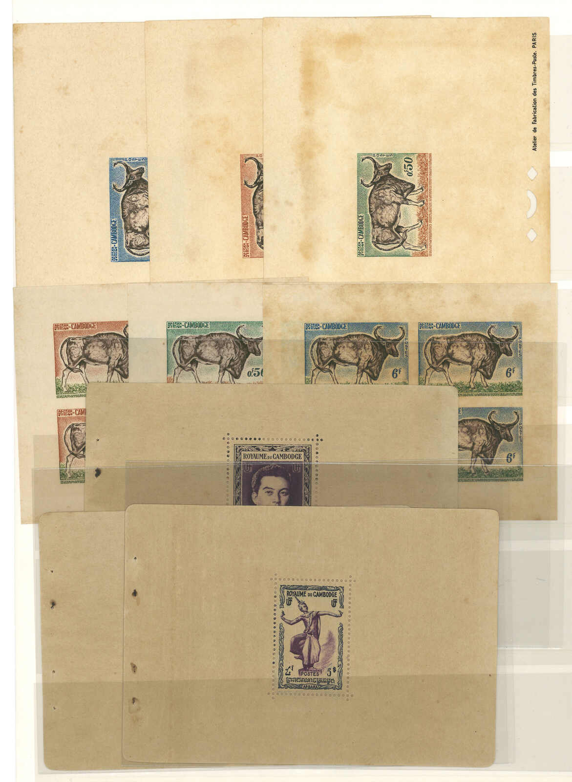1950至1960年代柬埔寨飛天女神、保護野生動物及奧運加蓋航空票豪華試印張、無齒方連及首日封一組。無貼微黃。上品。(Image 1) (Image 2)