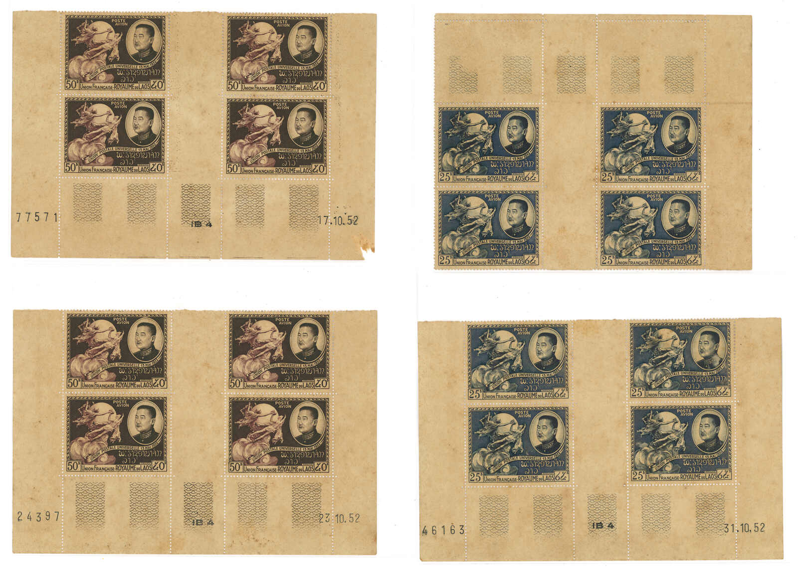 448 **/bof image1952 Laos 1st Annin of Admission to UPU airmail stamp in gutter block of 4 complete set, MNH. Light toning.
