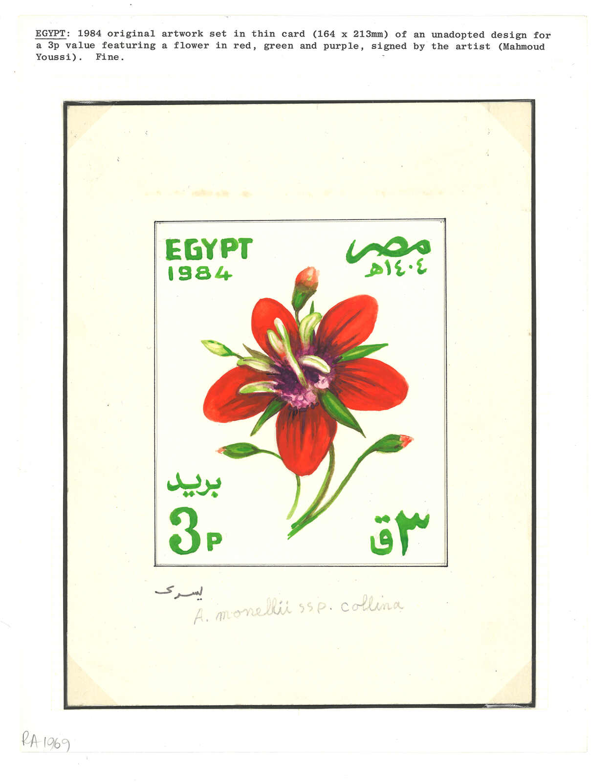 453 image1984 Egypt unadopted Flower 3p artwork on stockcard (164 x 213 mm), with designer Mahmoud Youssi signature. Very Fine.