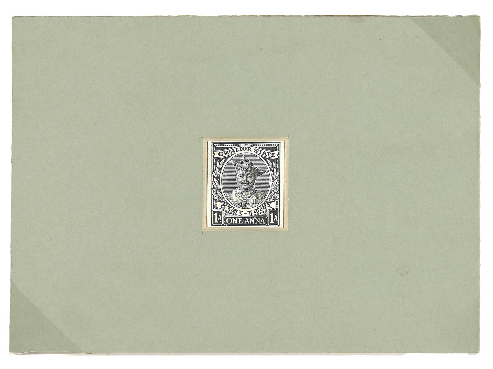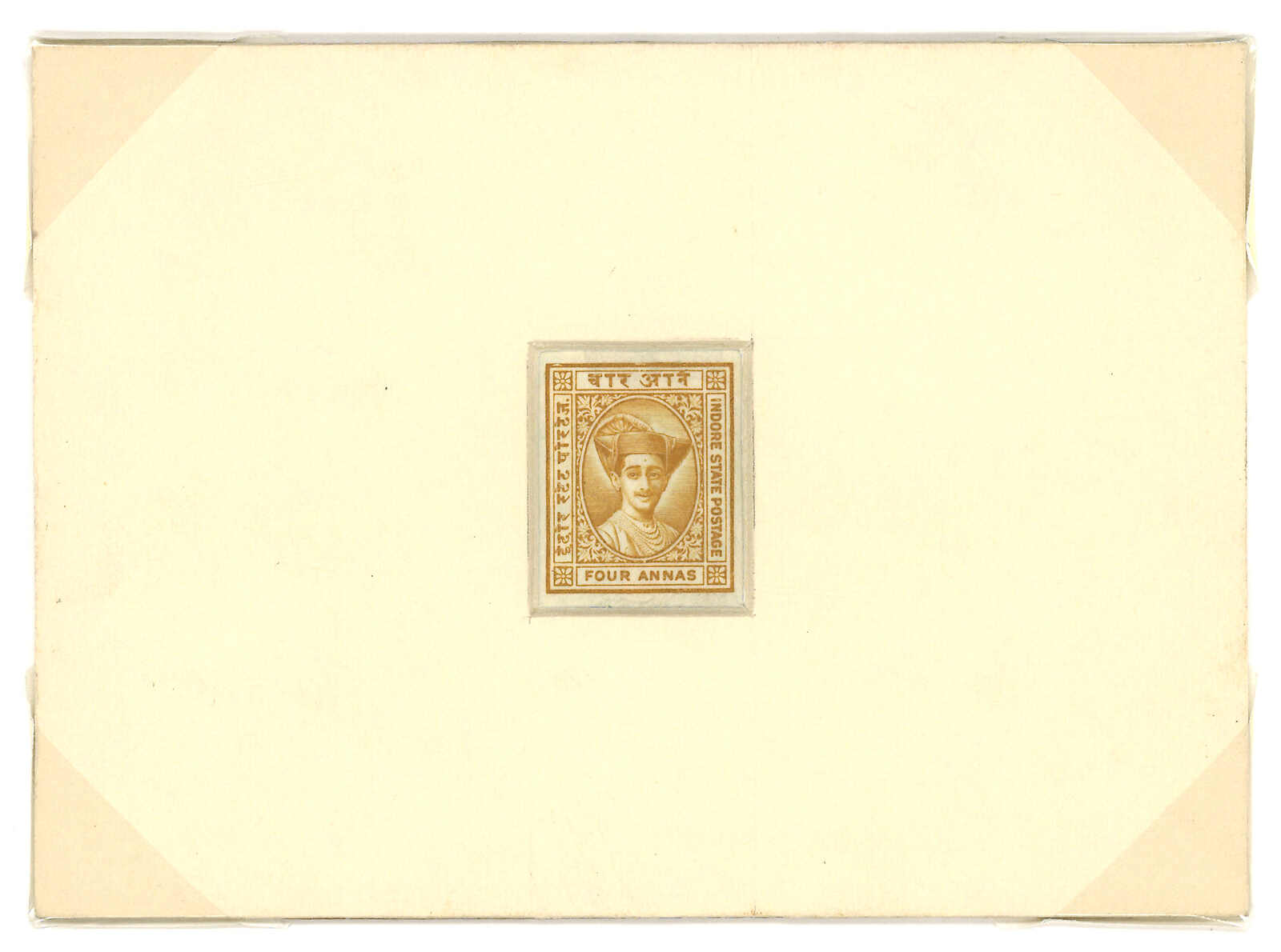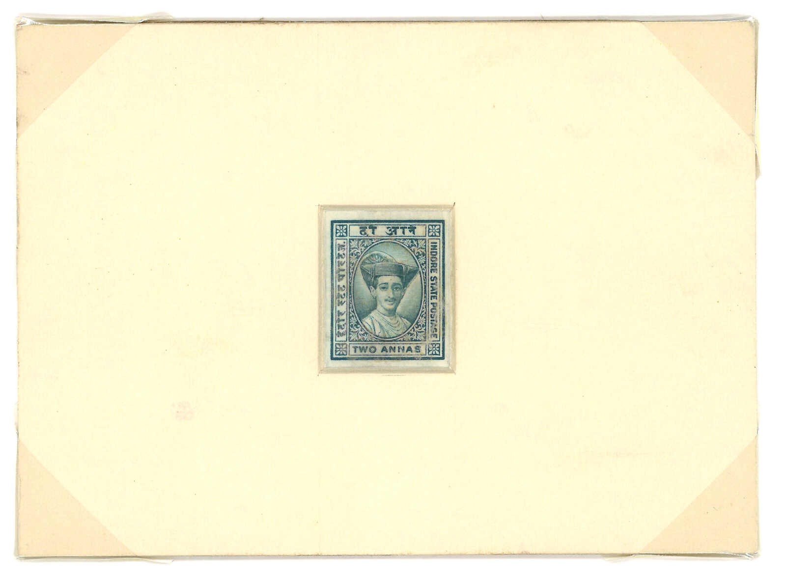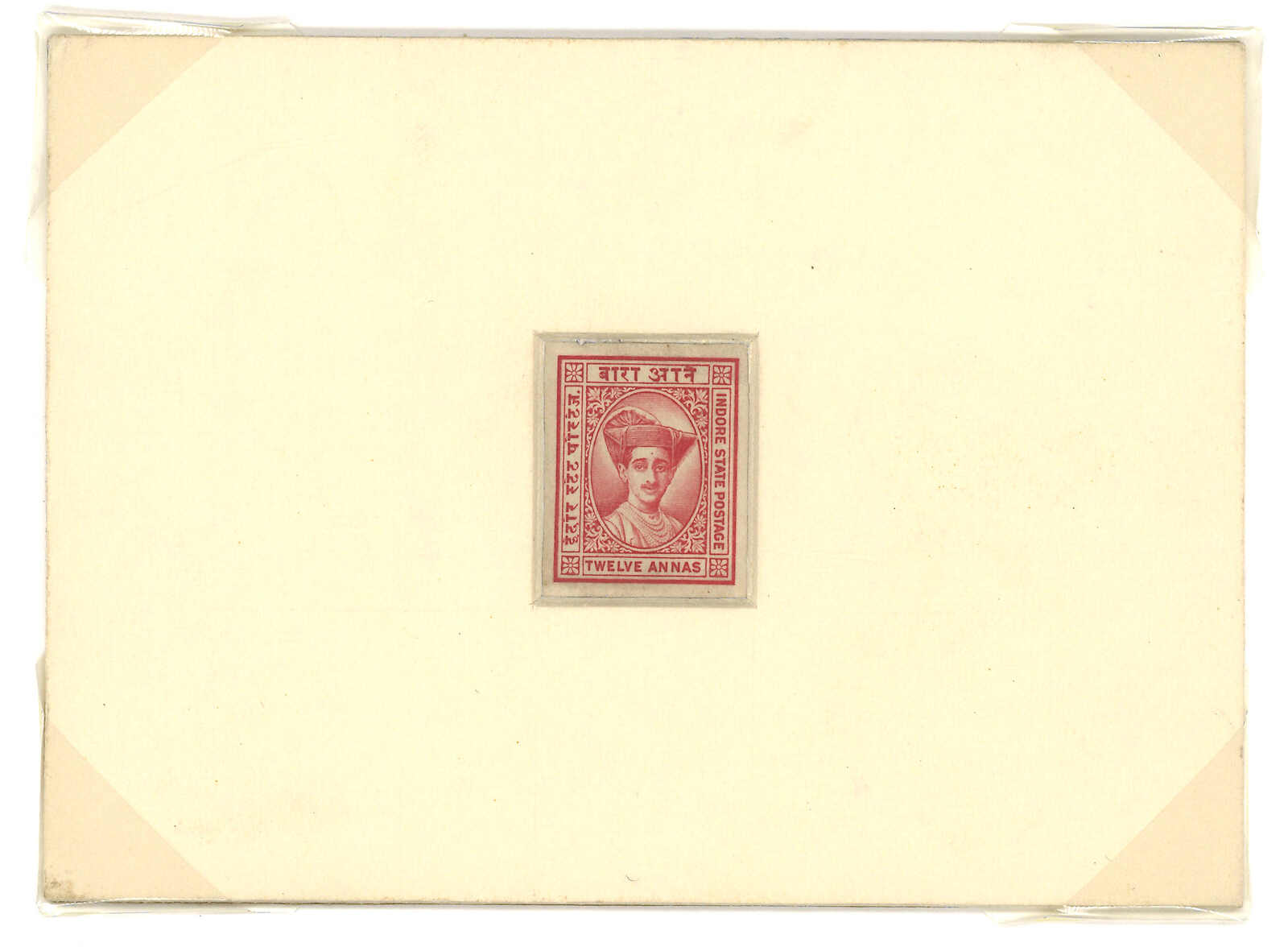 418 * imageIndore State Maharaja Yeshwant Rao II 2a, 4a and 12a die proof mounted on stockcard. (size 12 x 8.5 cm).