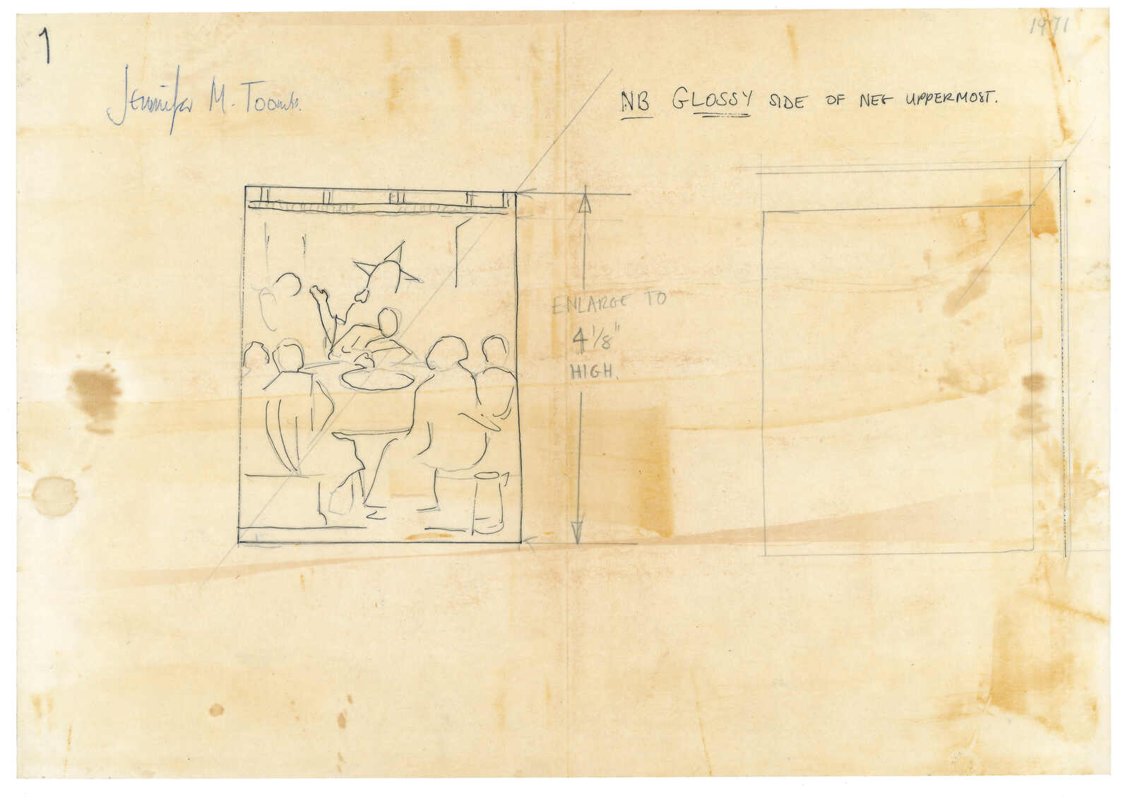 1971年安堤瓜“丟勒復活節木雕”郵票設計稿,畫於亮面紙上。(Image 1) (Image 2)