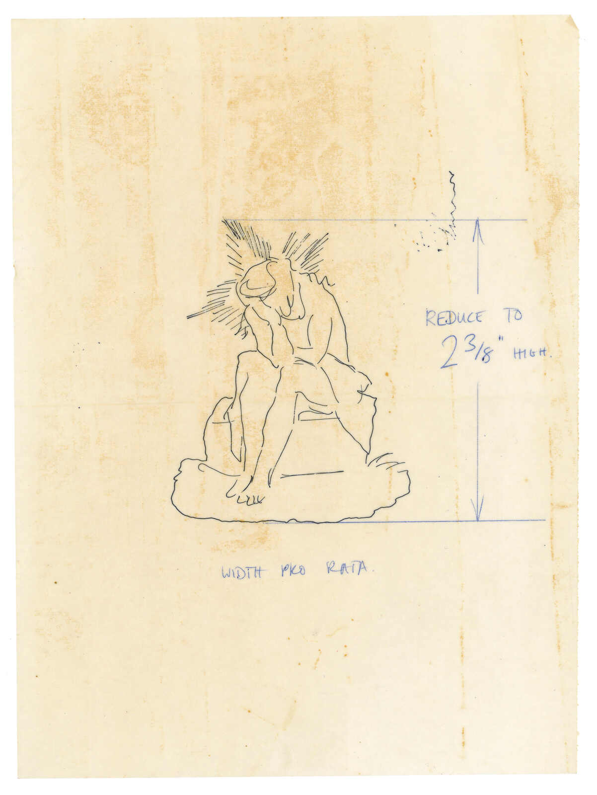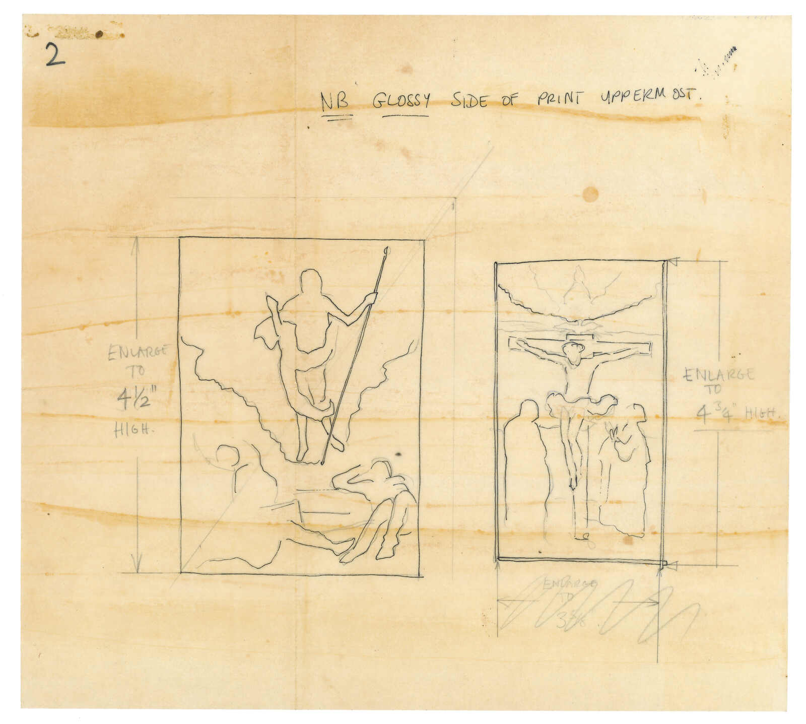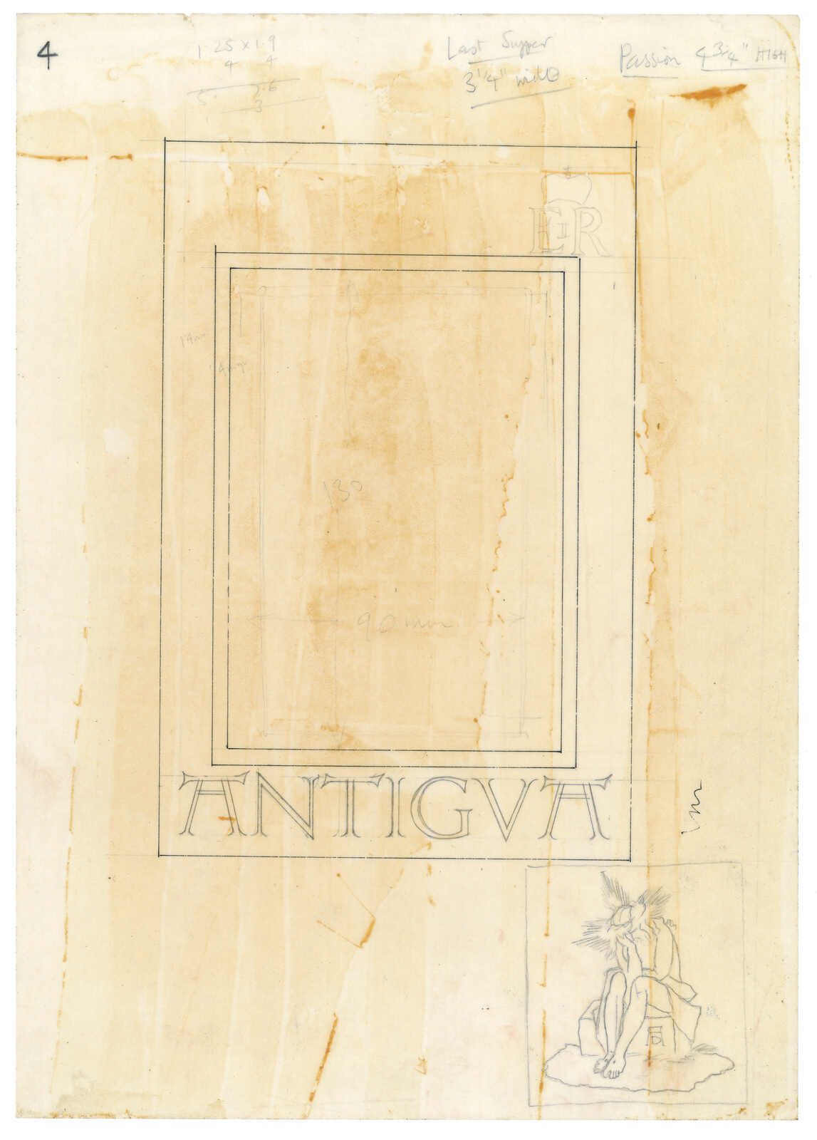 455 image1971 a pair of Antigua "Easter - Wood Carvings by Albrecht Durer" stamp design sketch on glossy paper.