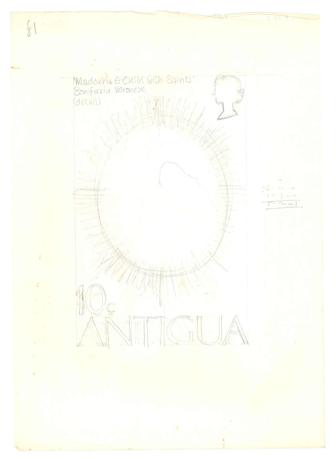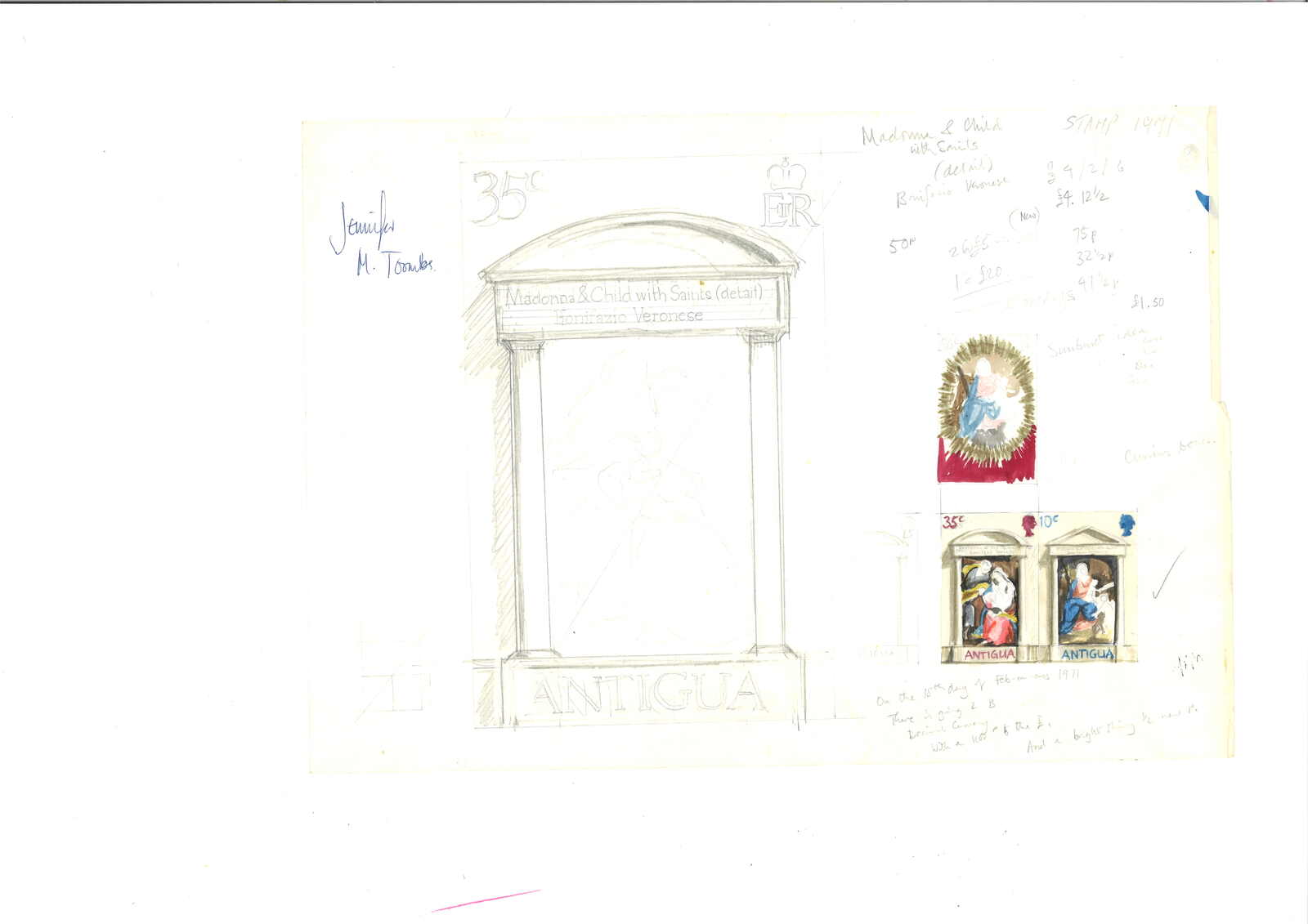 456 image1971 Antigua "Madonna & Child with Saints" 35c stamp design sketch (size 29 x 21 cm).