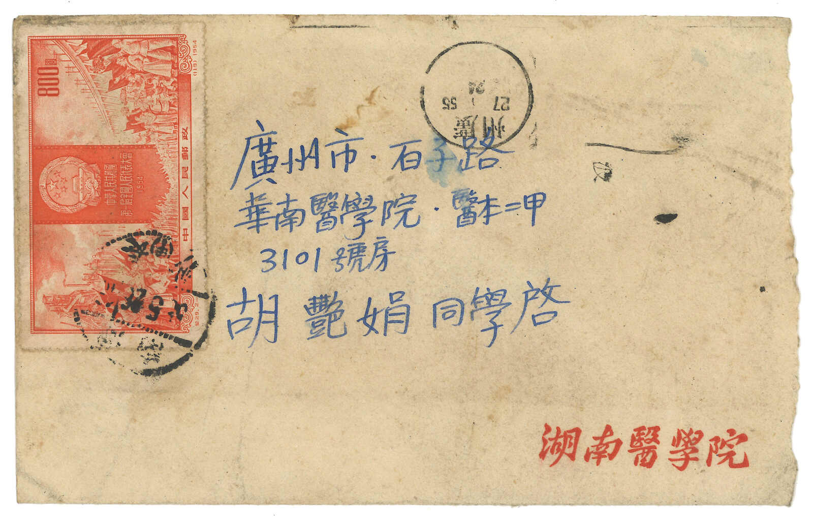 1955 Hunan Medical Schoo, Changsha (26 May) to Canton, f.w. C29 1st National People’s Congress $800 single, tied by Hunan Changsha cds. Arrived Canton (27 May). Cover opened at right.