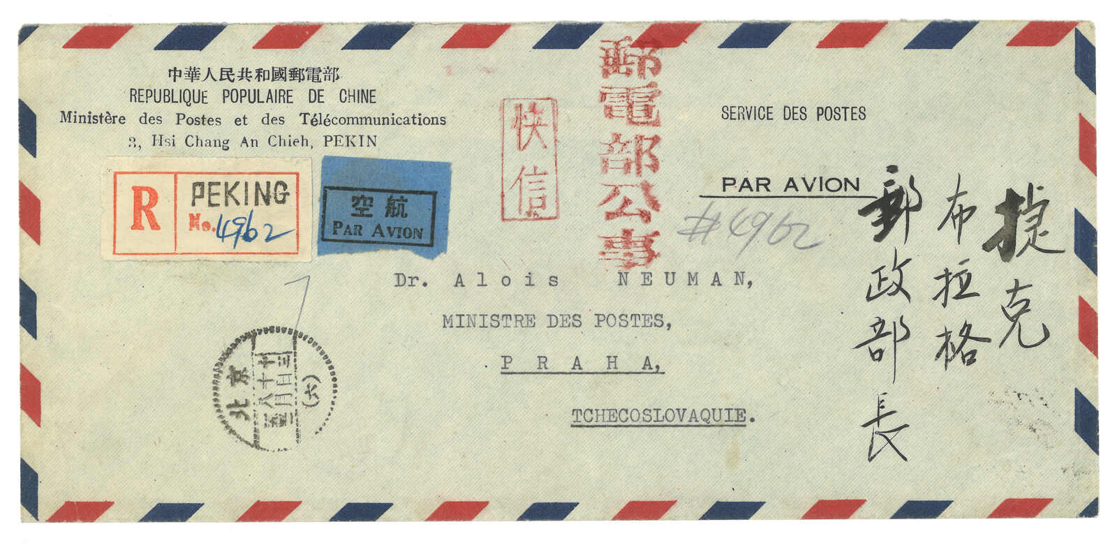 1951 (10 Aug) Minister of Post and Telecommunication on service express cover to Czech Postmaster, with vertical official seal and Peking origin cds. Scarce on service cover.