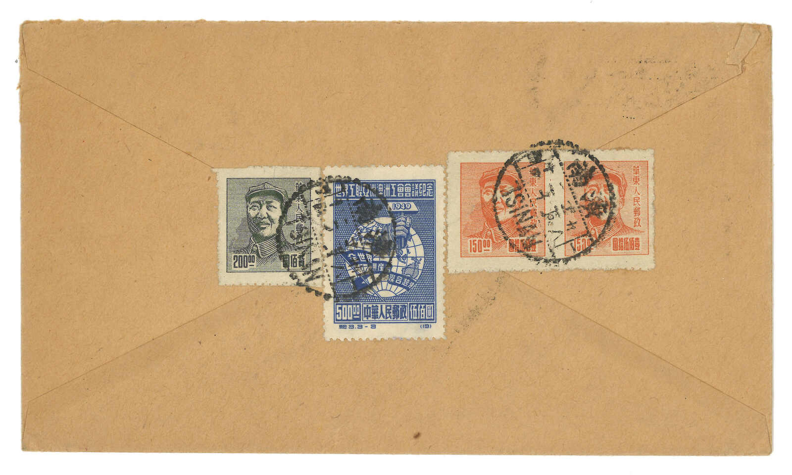 1949 Cheeloo Univeristy, Tsinan (20 Nov) to Canada, f.w. East China People’s Post $150 in pair + $200 + C9 (3-3) 30th Anniv of CCP $500, in total of $1000, tied by Tsinan bilingual cds. Interesting combination franking of