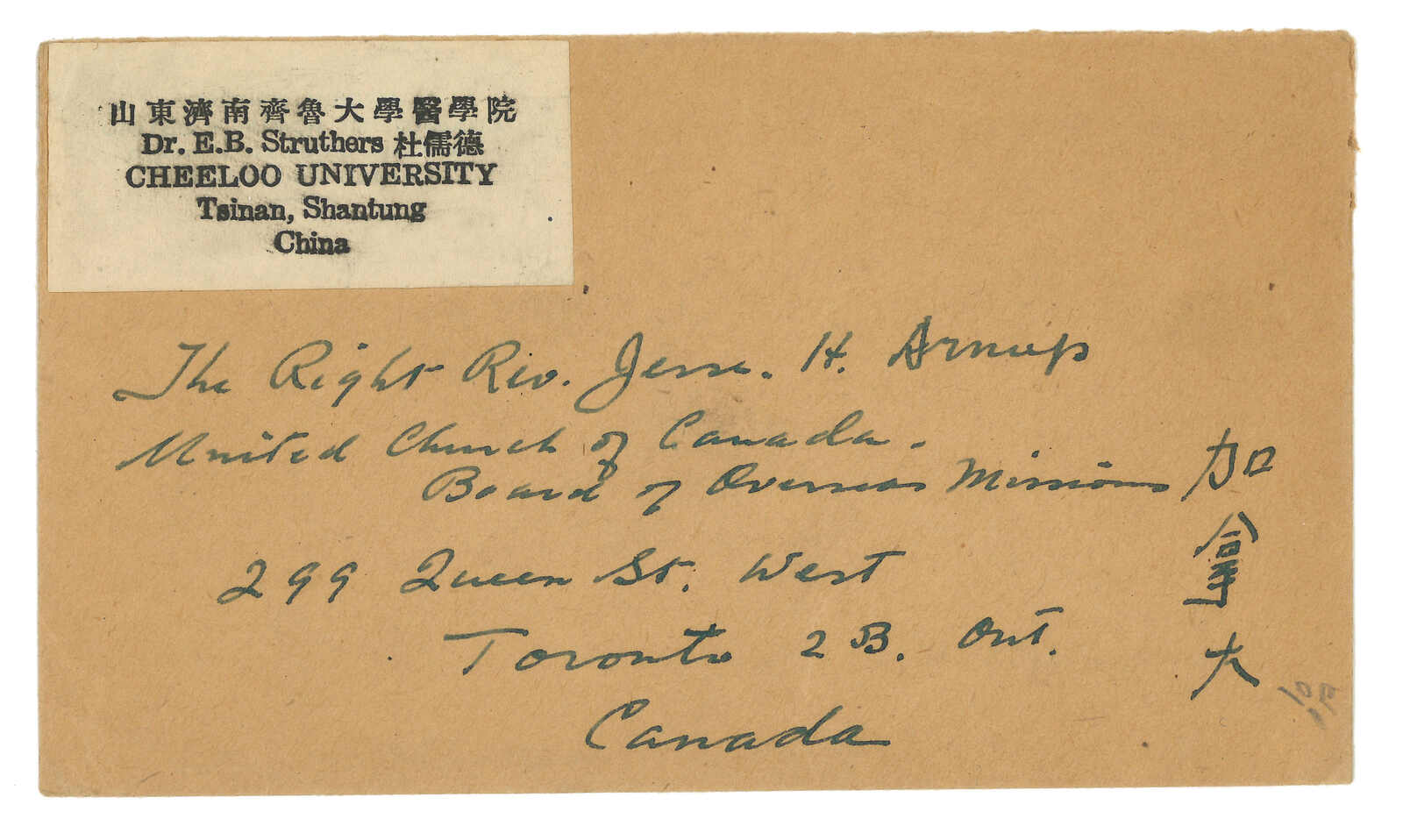 1949.11.20 濟南齊魯大學寄加拿大,背貼華東人民郵政150元雙連 + 200元 + 紀9(3-3)共產黨三十週年500元,銷濟南三格漢英日戳。 有趣之解放區票與紀票混貼例。(Image 1)