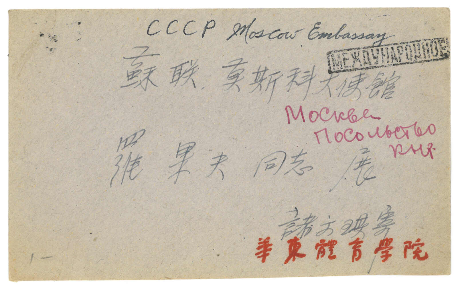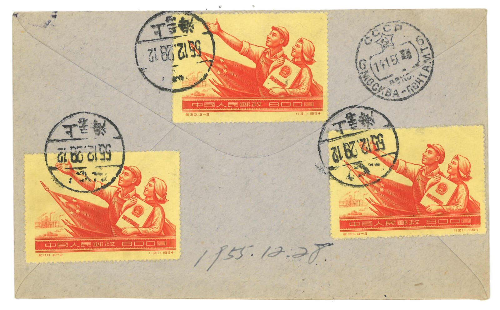 1955 Shanghai (29 Dec) to USSR, f.w. C30 Constitution (2-2) $800 x3 on reverse, tied by Shanghai bilingual cds. Arrived Moscow (11 Jan).