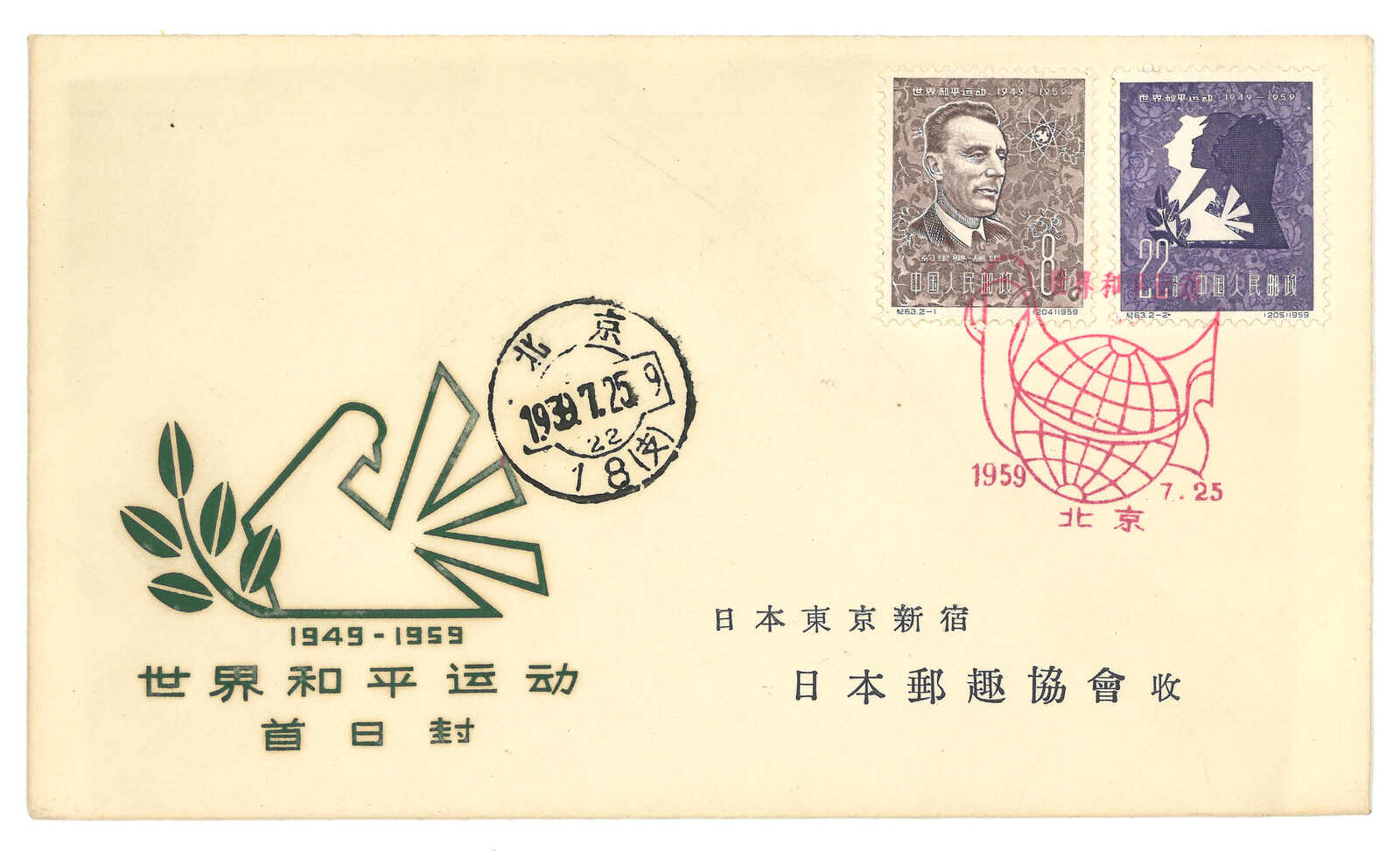 1959 (25 Jul) C63 World Peace Movement - China Philatelic Co FDC to Japanese Philatelic Society, f.w. complete set of 2, tied by commemorative d..s