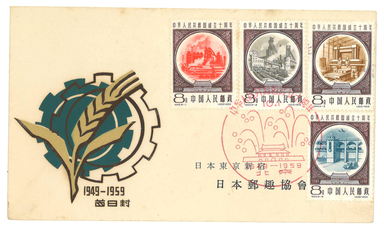 1959.10.1 紀69建國十週年(三)-中國集郵公司首日封寄日本郵趣協會,銷紀念日戳。(Image 1)