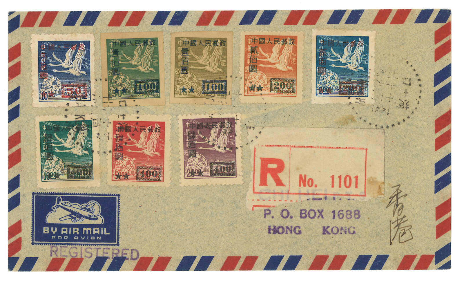 1951 Hankow (19 Nov) to Hong Kong. Airmail registered cover, f.w. SC5 Flying Geese Silver Yuan surch Chinesee People's Post complete set on front and Tienanmen $100 + SC6 $50 on reverse, tied by Hankow bilingual cds. Transit