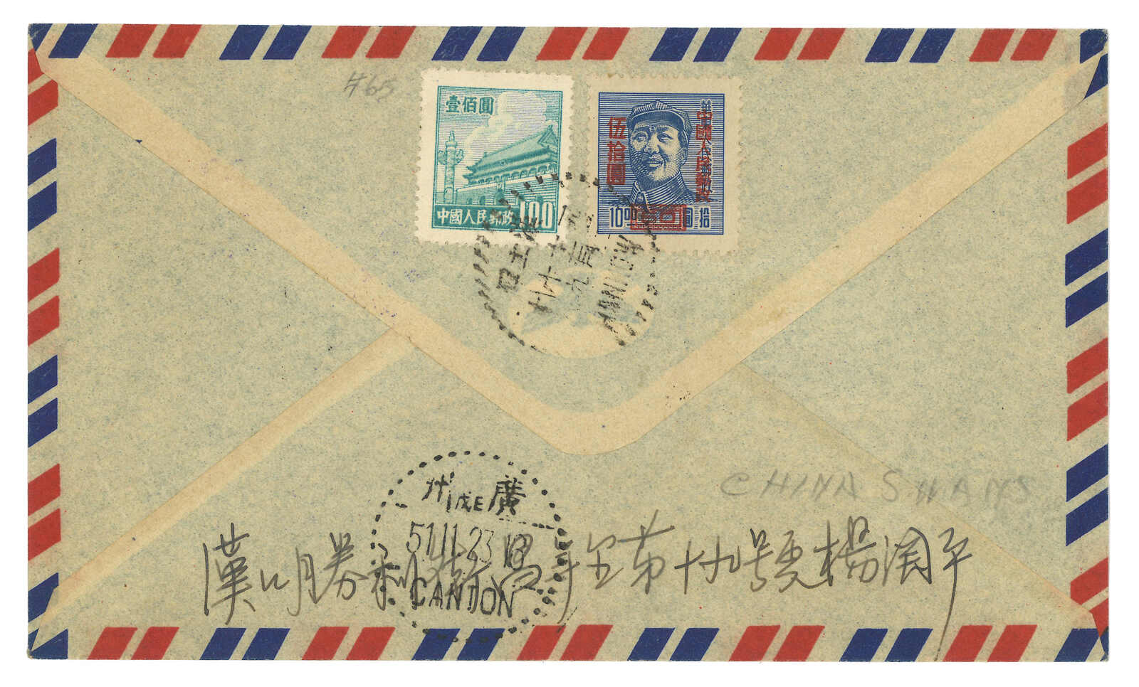 1951.11.19 漢口寄香港。掛號航空封,正貼改5飛雁改值中國人民郵政全,背貼天安門100元 + 改6毛像50元,銷漢口三格漢英日戳。11.23經廣州。(Image 1)