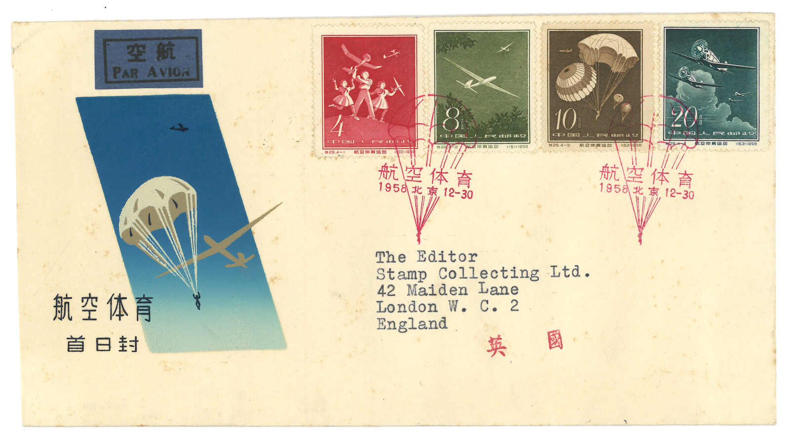 1958 (30 Dec) S29 Aviation Sports - China Philatelic Co. FDC to England, uprated by C49 20f in pair on reverse, tied by commemorative d.s. and Peking cds. complete set (Scott 394-397),