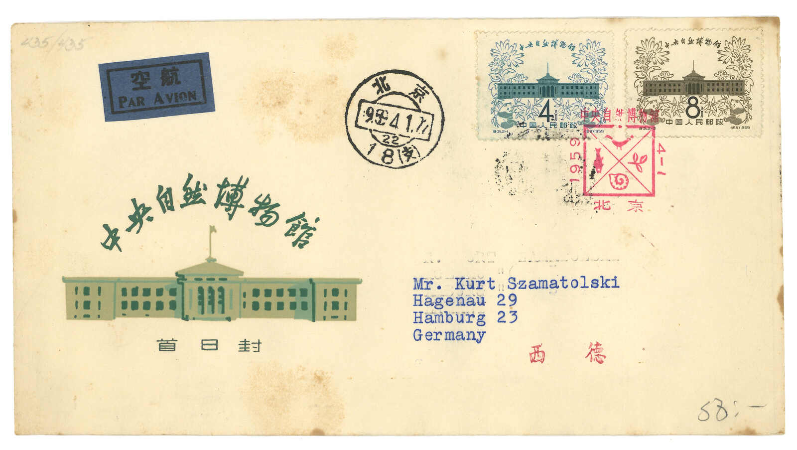 1959.4.1 特31自然博物馆 - 中國集郵公司首日封寄西德,背另貼紀50及特29單枚,銷紀念日戳及北京日戳。(Image 1)