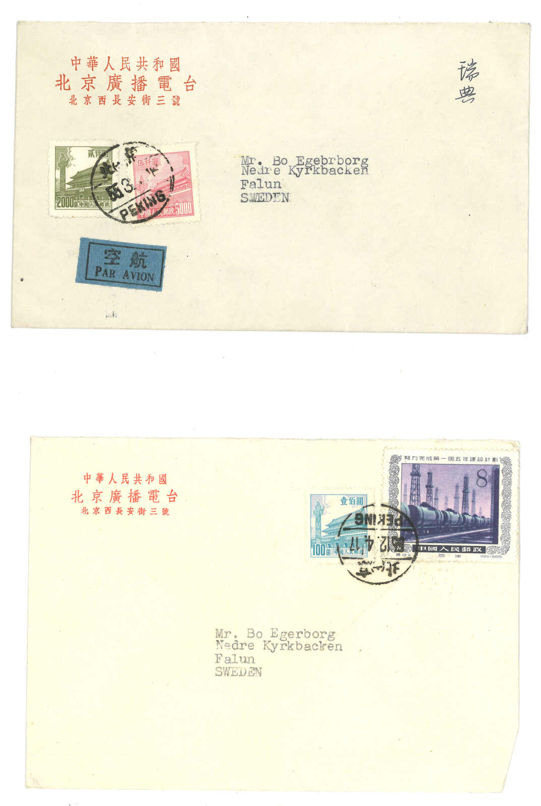 1950年代一組四件北京廣播電台封寄瑞典,貼不同普票。當中一件混貼新舊人民幣值之普7天安門100元及特13五年計劃8分。(Image 1)