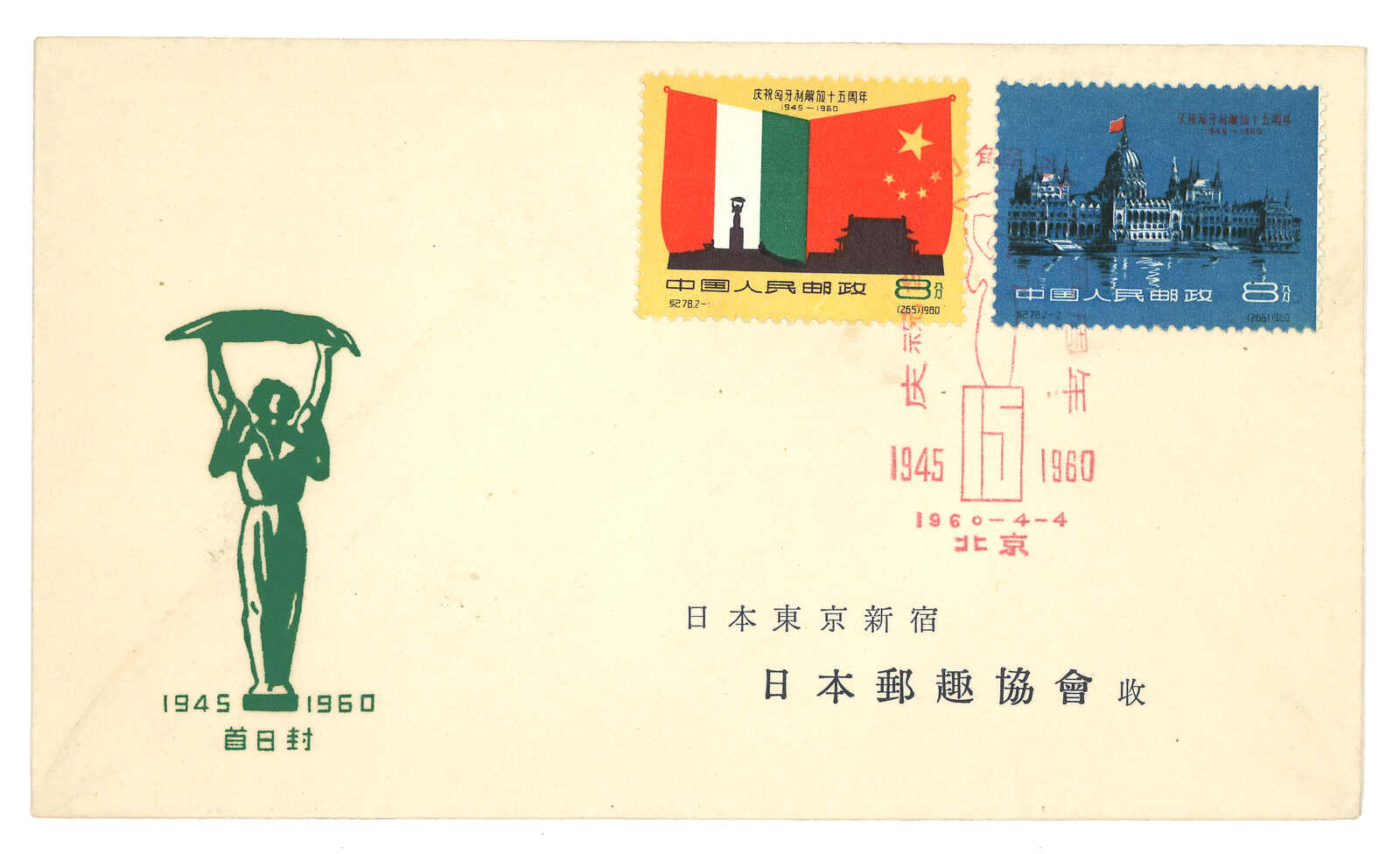 1960 (4 Apr) C78 15th Anniv of Liberation of Hungary FDC to Japan Philatelic Co, f.w. complete set of 2, tied by commemorative d.s.