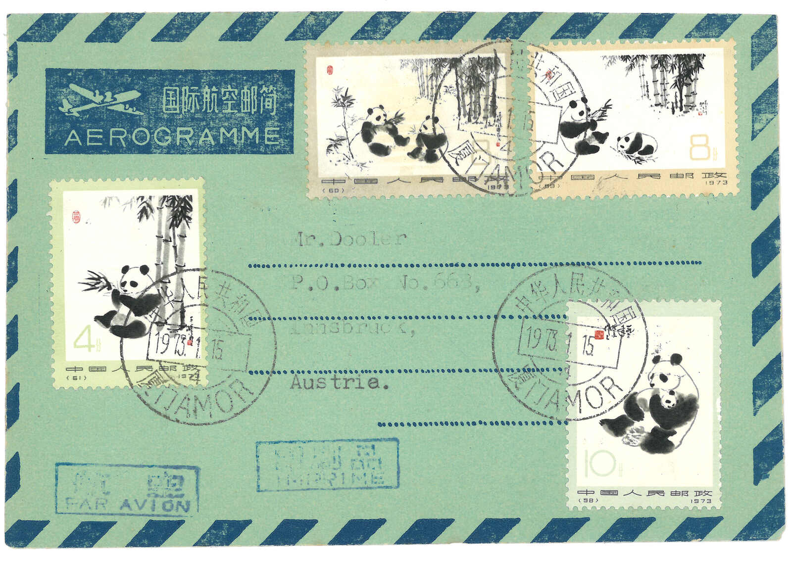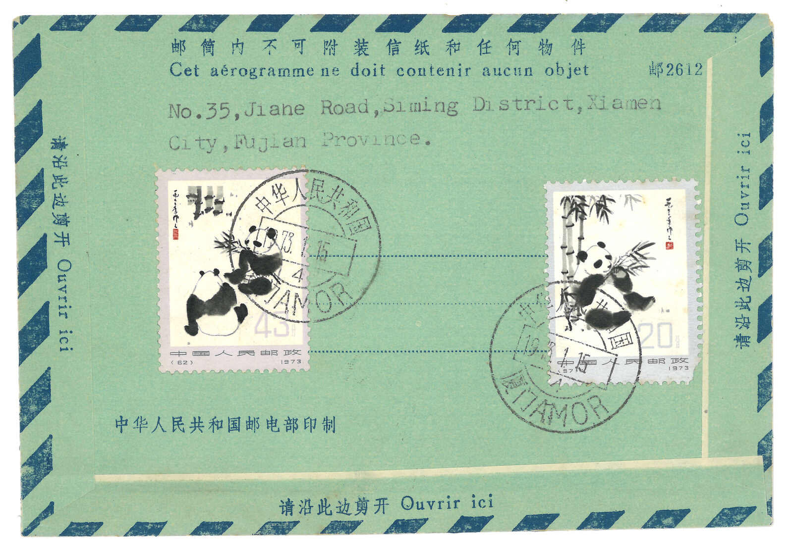 1973.1.15 N57-62熊貓首日航空郵簡自廈門寄奧國,銷廈門漢英海關日戳。(Image 1)