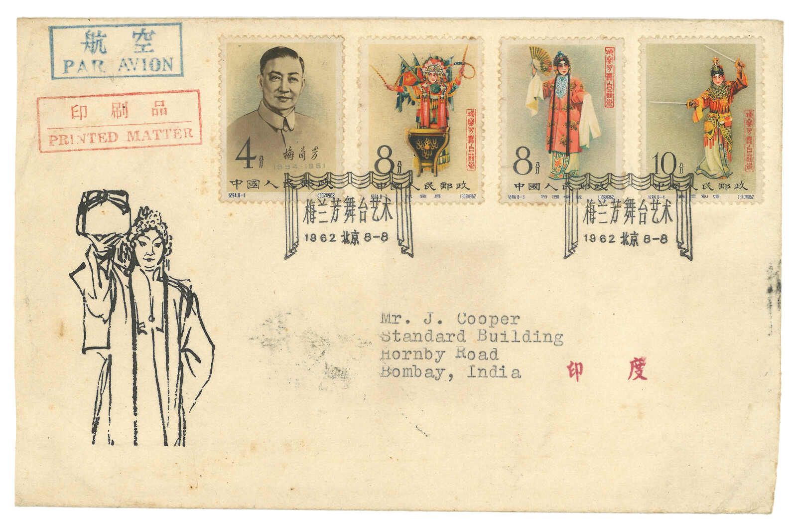 1962 (8 Aug) C94 Mei Lanfang (8-1) to (8-4) China Philatelic Coporation FDC from Peking to philatelist J Cooper, India, additionally f.w. S44 8f and R series odd value on reverse, tied by Peking commemorative d.s. and Peking
