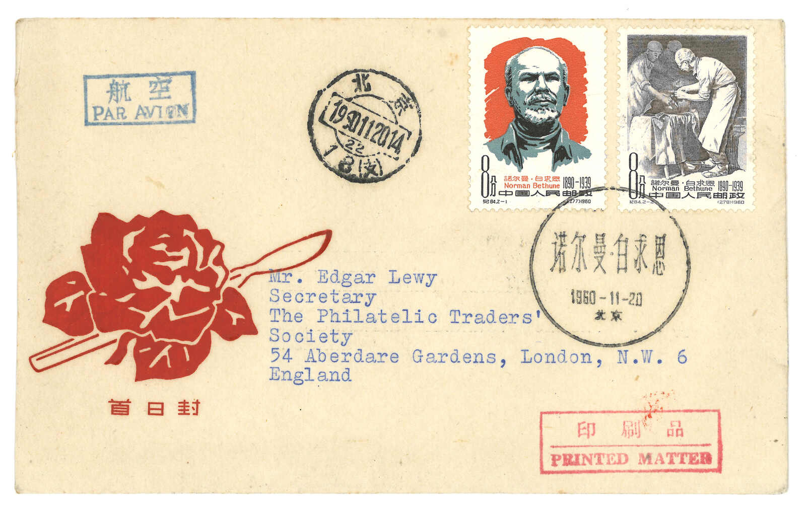 1960 (20 Nov) C84 Dr.Norman Bethune - China Philatleic Co FDC to England, uprated by C83 8f on reverse, tied by commemorative and Peking cds.