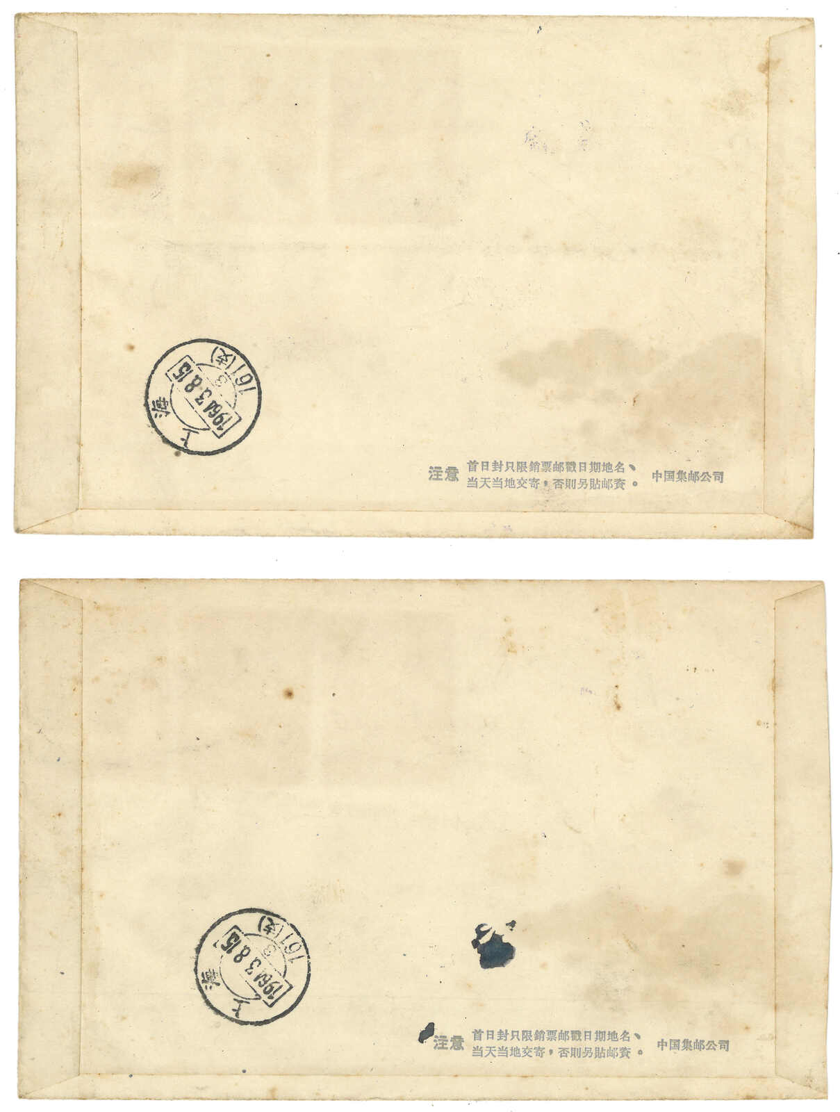 中國集郵公司首日封一套兩件寄上海,銷紀念日戳,旁見掛號標籤及航空章。(Image 1)