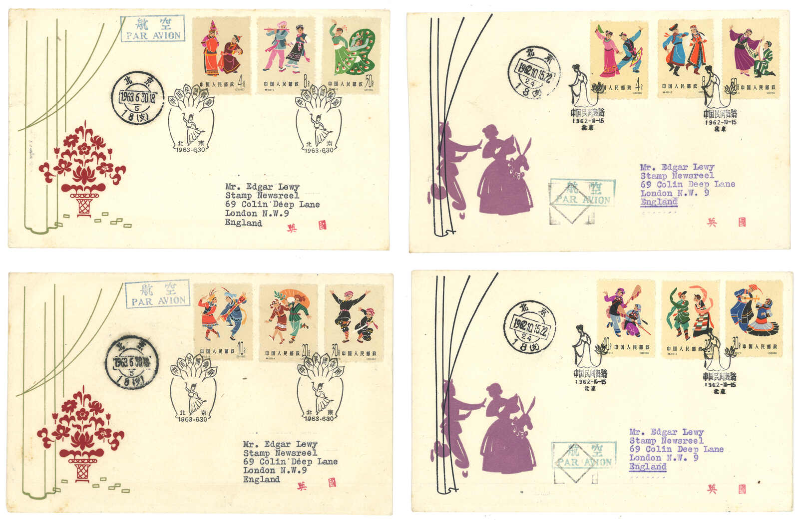 1962及1963年特49舞蹈(一)及1963年特55舞蹈(三)中國集郵公司首日封各一套2件,共4件封,均寄英國,銷紀念日戳,旁鈐航空章。(Image 1)