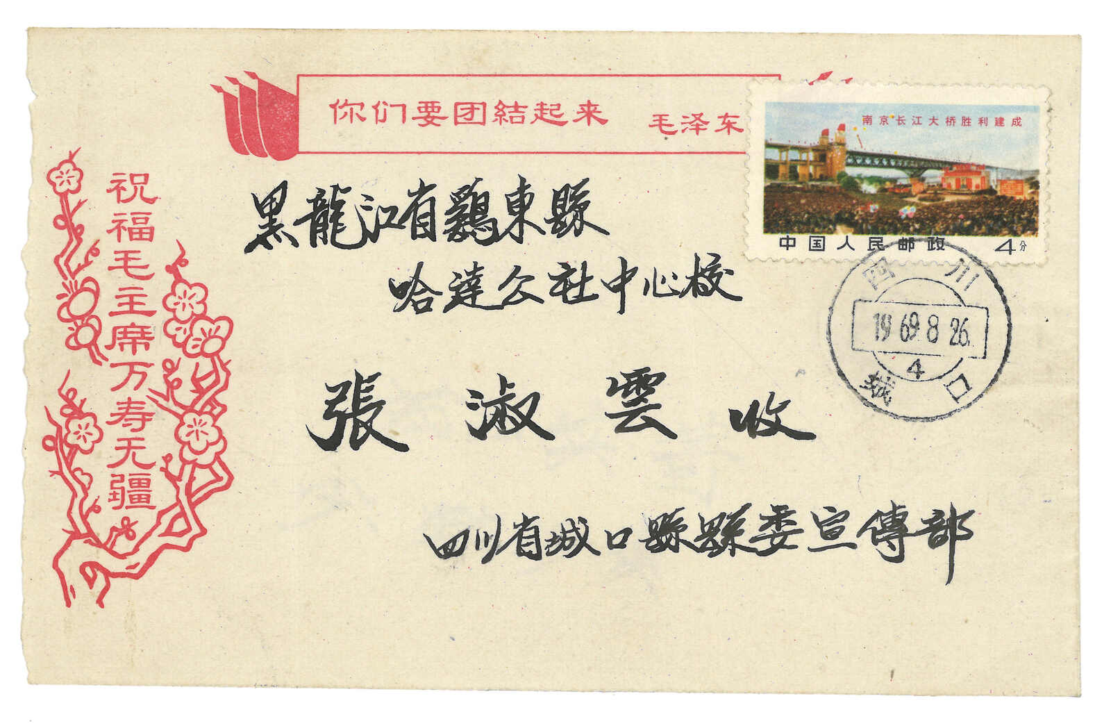1969.8.26 文14長江大橋4分自然實寄首日封,自城口寄雞東,背另貼普票2分雙連,銷四川城口日戳。9.3抵哈達。帶毛語錄。封左側打開。(Image 1)