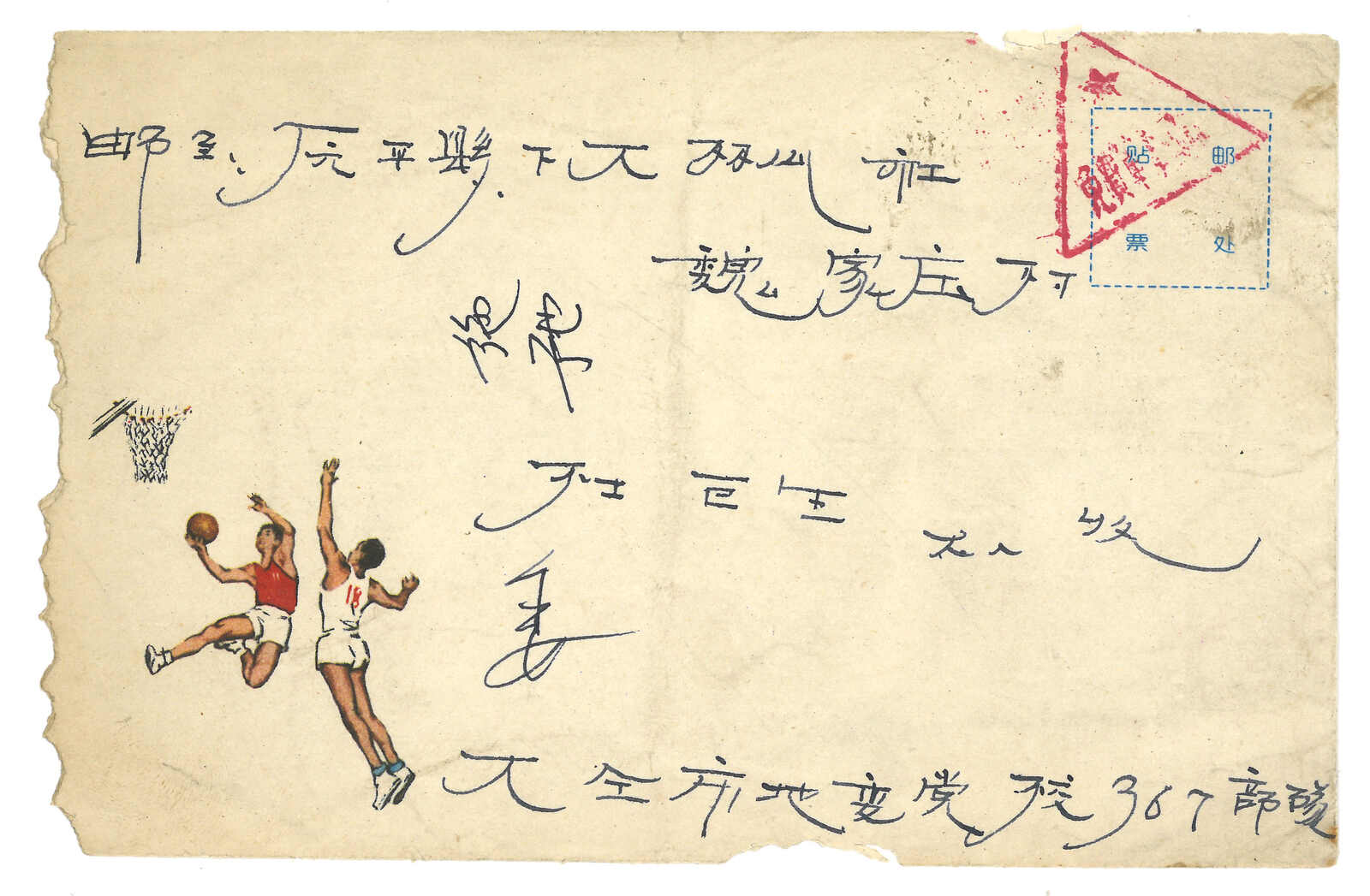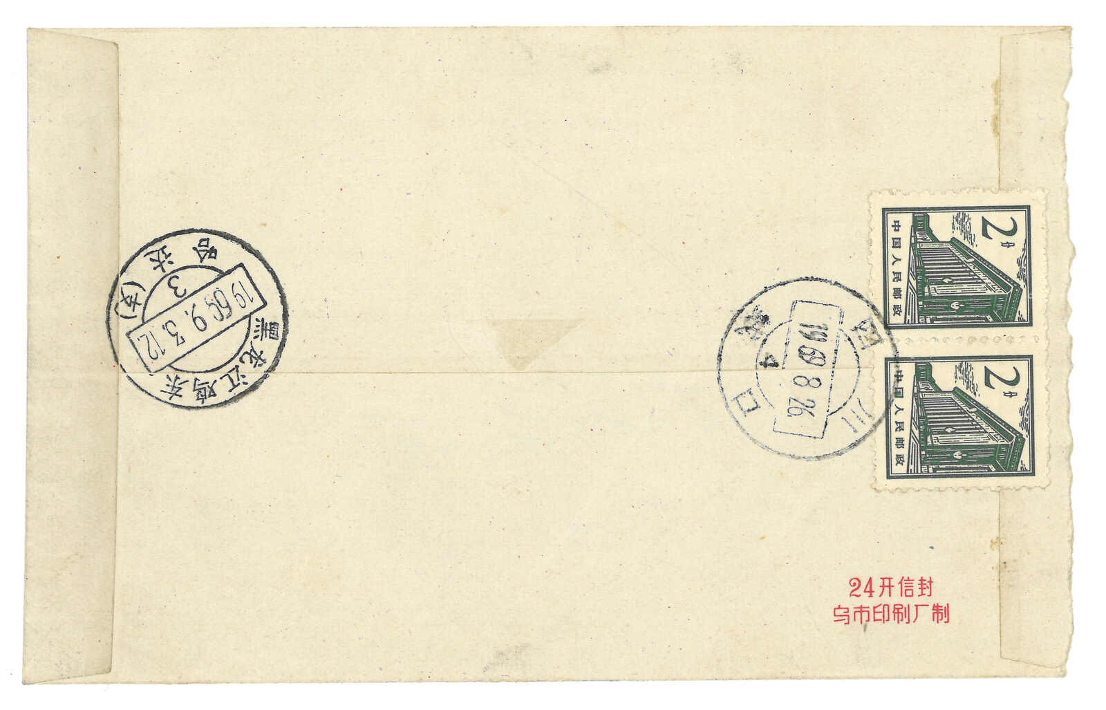 1969.4.16 大同寄原平,鈐三角形“免費軍事郵件”戳。但由於此戳於4月1日已停用,故背面加貼文11林彪題詞補資,銷山西大同日戳。有趣少見。(Image 1)