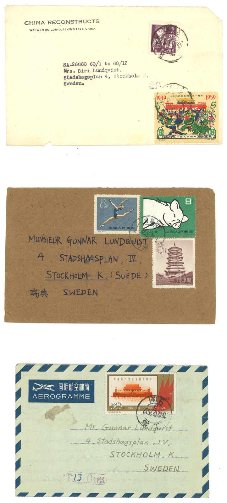 1960s a group of 3 PRC covers to Sweden, f.w. C&S series issues, including C72 1st National Games, S40 Pig-Breeding, C88 40th Anniv of CPC etc, tied by Foochow, Shanghai and Peking cds.