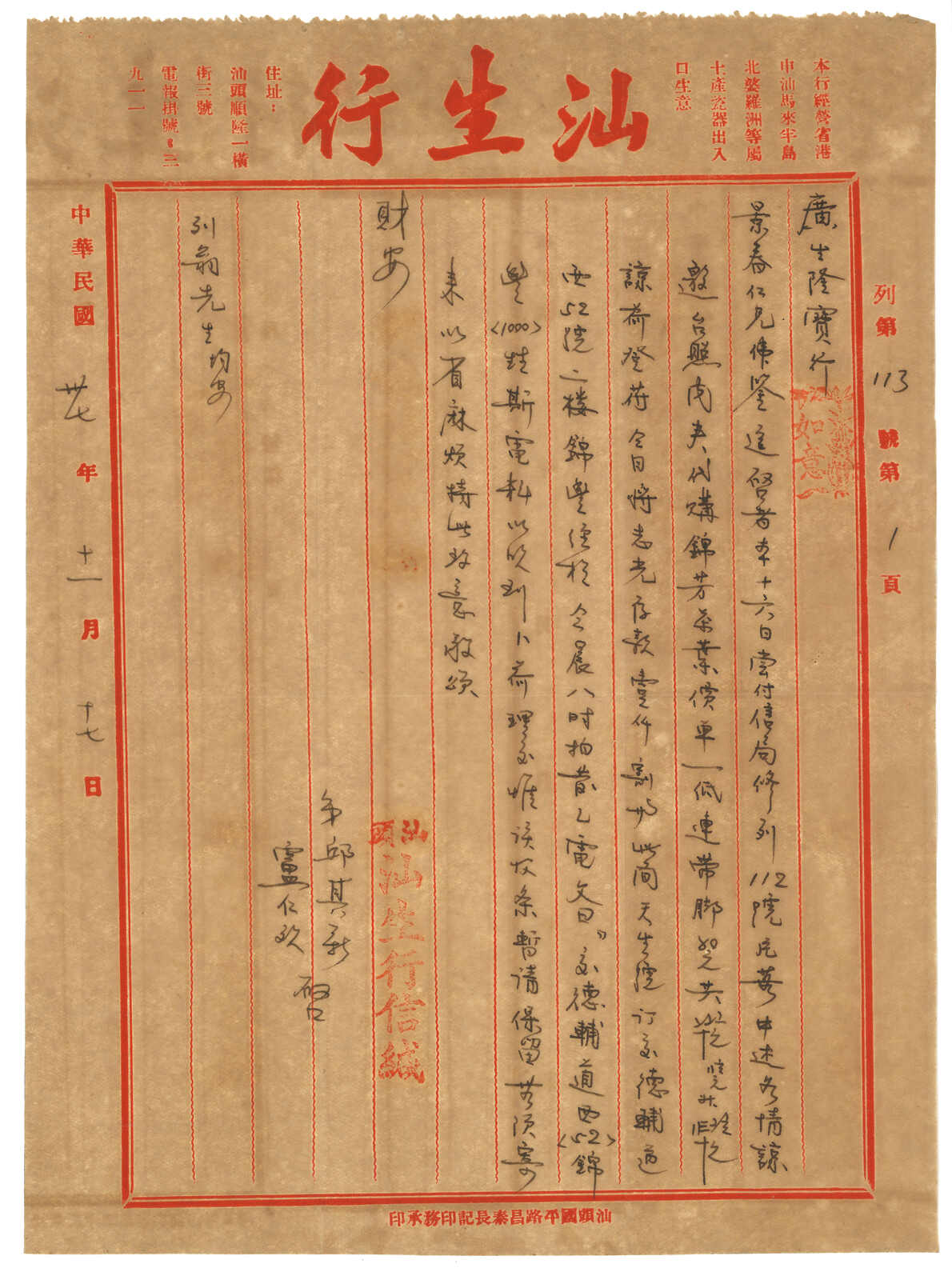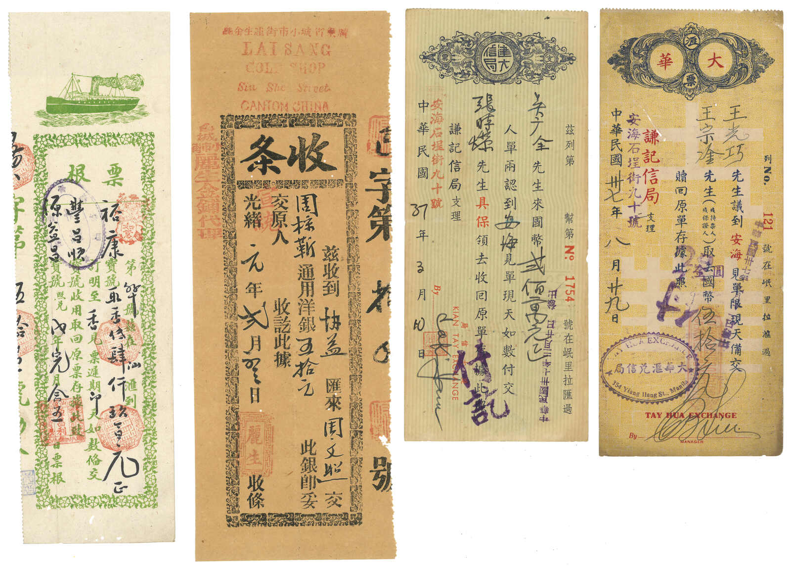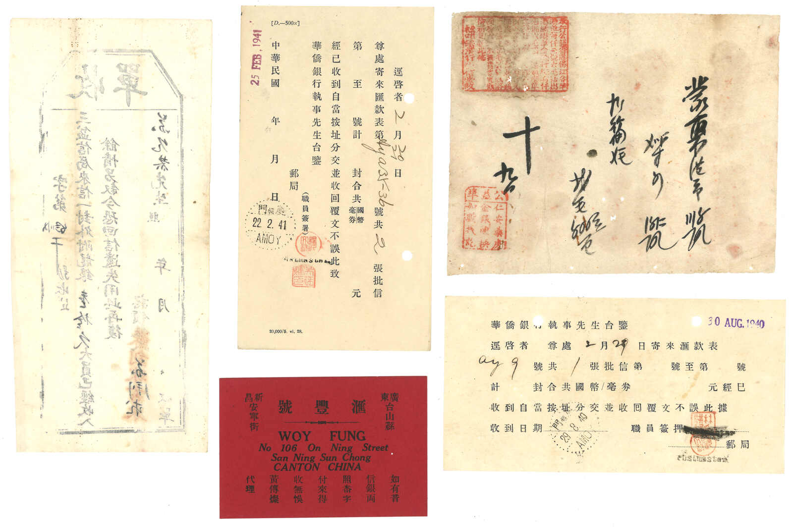 一組約18件匯款單、股份及其他文件,部分出自華僑銀行或其他僑批局。(Image 1)