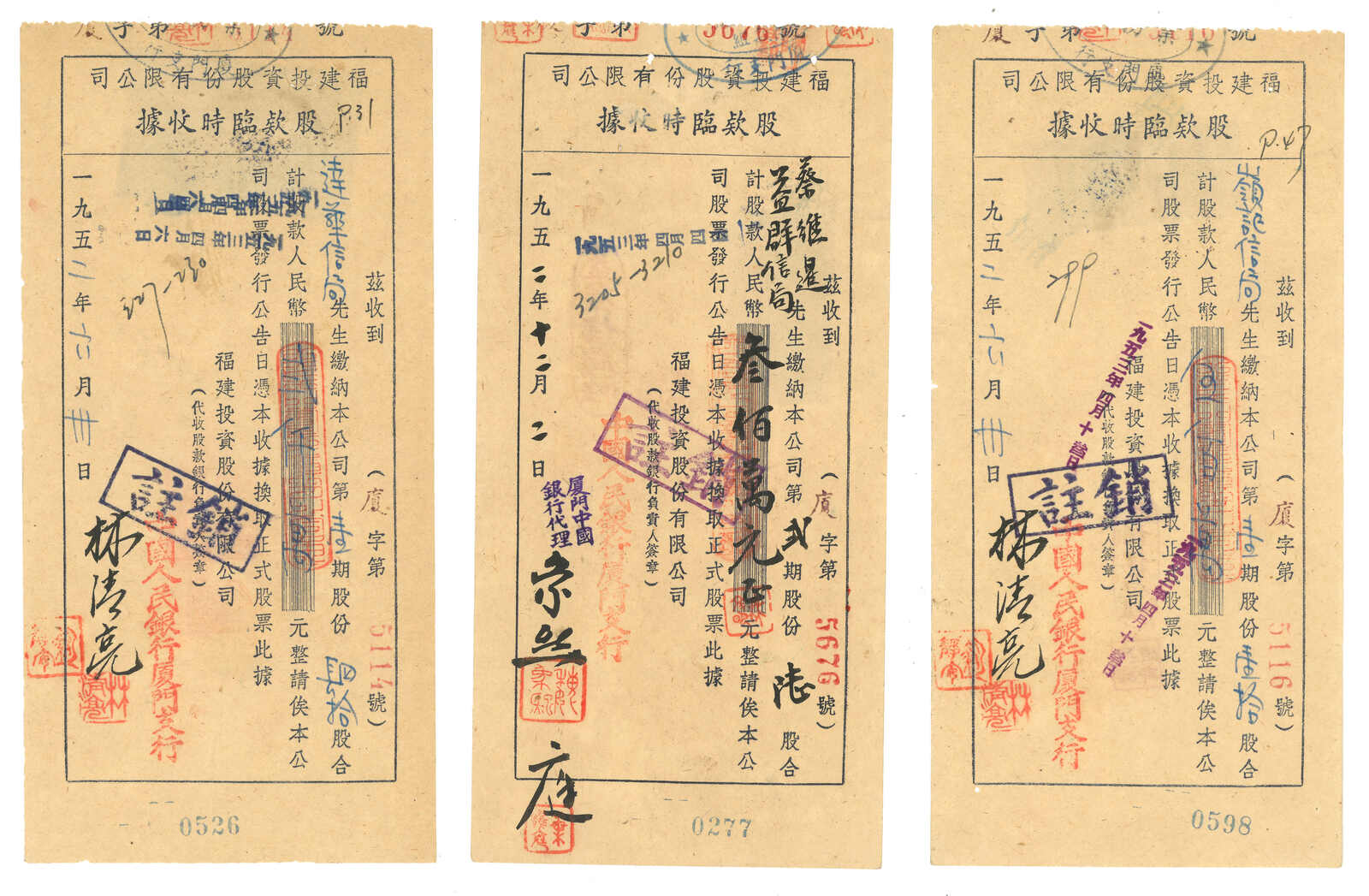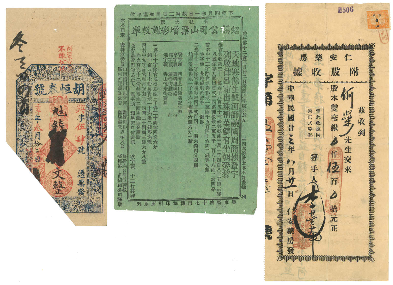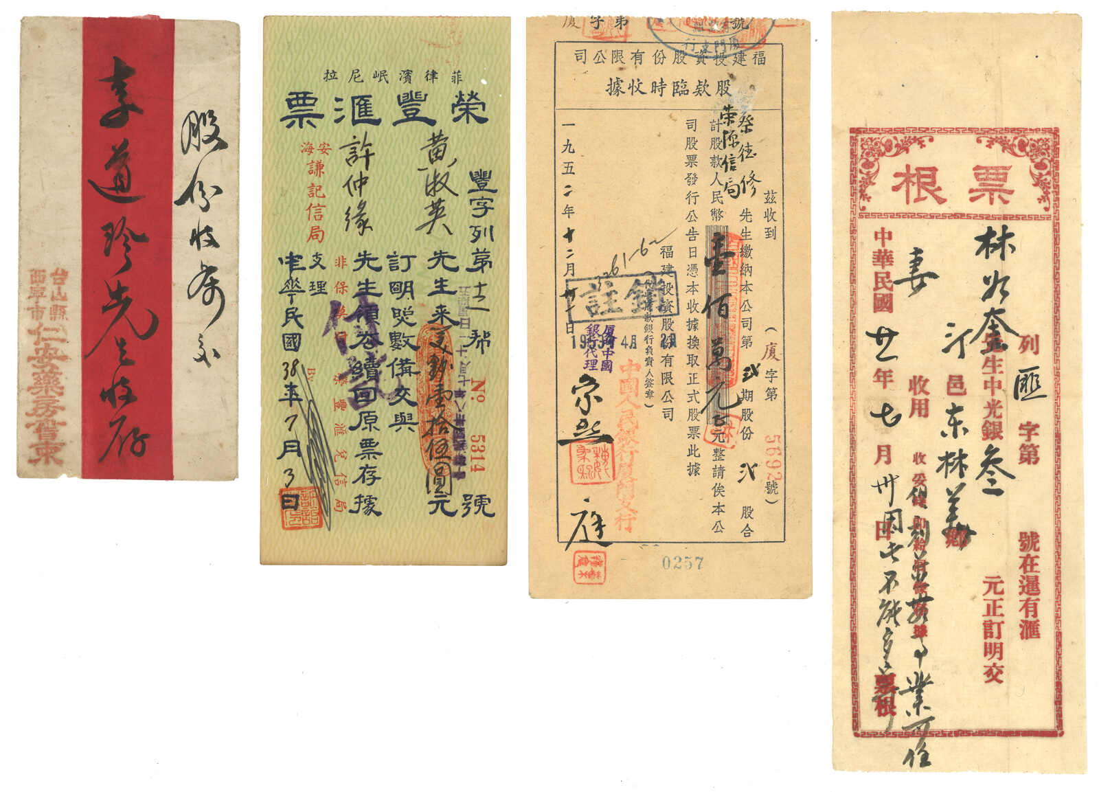 An assorted group of about 18 remittance slips, share certificates and other documents. Partly from OCBC or other Qiaopiju.
