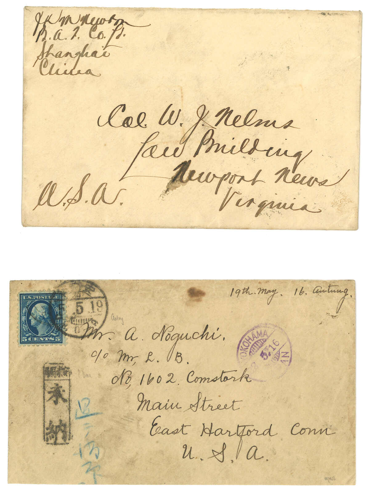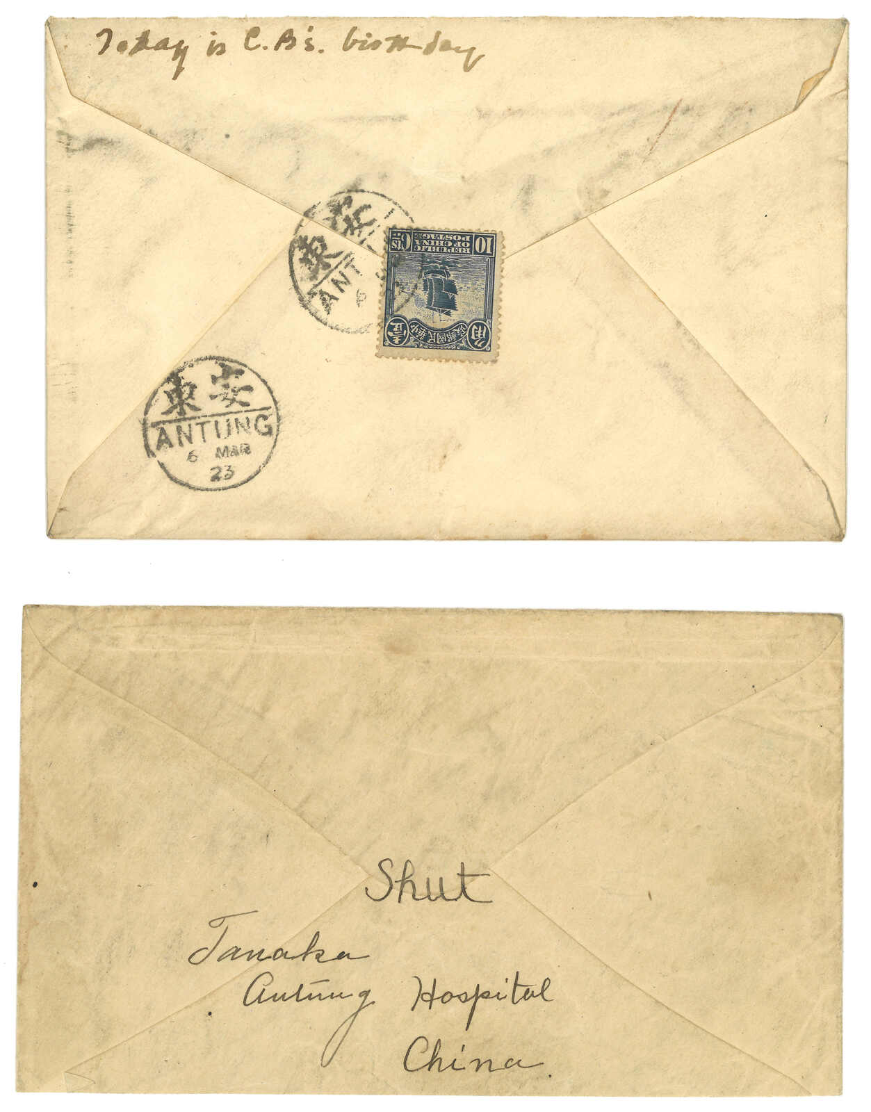 1923及1932年一對安東寄美國封,前者貼帆船1角,銷中國郵局日戳。後者貼美國票5分,銷日本郵局日戳,並被視為欠資。反 映了日本入侵前後之郵政史。(Image 1)